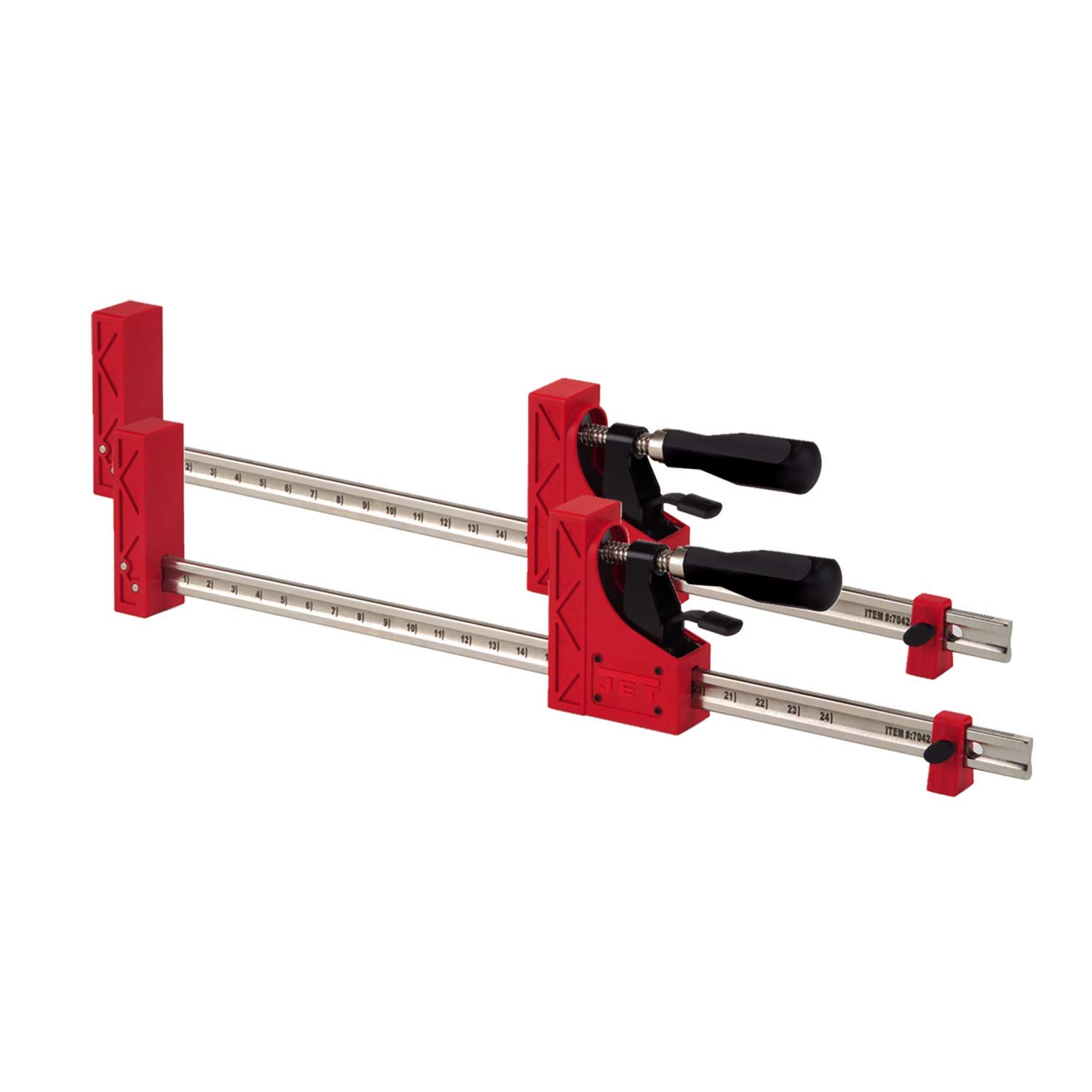 Amazon.com The JET 70424-2 24-Inch Parallel Clamps (Two Pack) provide powerful 90-degree clamping capabilities at up to 1,000 pounds of pressure. These versatile clamps include movable jaws that can be reversed and used as spreaders. Easy to use, the clamps feature SumoGrip handles that provide comfort and increase torque. They even have an innovative measurement system for quick identification of opening capacities. Deep Throats and Quick-Lock Jaws for Ease of Use Each JET 70424-2 is a well-constructed 24-inch parallel clamp with a deeper-than-standard throat and wide jaw, so it will be indispensable to your workshop. For convenience, the clamps' Slide-Glide triggers easily lock the jaws into place, allowing for smooth movement. Clever Rail Design Makes Tough Jobs Easy Each 70424-2 rail features an innovative Precision-Rule Measurement System that provides you with consistent setups and exact readings on your openings--a feature other clamps fail to provide. What's more, the moveable rail stands add convenience and accuracy to both clamping and spreading jobs. Ergonomic Design Works for You The 24-inch parallel clamps feature ergonomic construction that's designed to work for you--not the other way around. Soft SumoGrip handles make the clamps easy to hold, and they also give you increased torque. The clamps do not take much strength to manipulate, yet can clamp up to 1,000 pounds of pressure. For further convenience, each Acme-threaded handle easily turns while applying continuous pressure. Built for Durability and Versatility These clamps are built to see you through all of your projects. Featuring a durable aluminum design, superior I-beam construction, and a fully-plated rigid backbone to prevent corrosion, each clamp is built for long-lasting use. Additionally, a non-marring composite resin covers each clamp's jaw face to prevent wear and tear and ensure even clamping pressure. Very versatile, each 70424-2 is designed with a workable profile that allows you to narrowly clamp on the side of the jaw face. For further flexibility, the clamps' moveable, reversible jaws can be dual-purposed as spreaders. What's in the Box JET 0424-2 24-Inch Parallel Clamp (Two Pack) Product Description At JET Tools, we see a future built on great brands, products, and people. In every facet of our business, we leverage the strengths of our global infrastructure to maximize the benefits of all three. From the Manufacturer The JET Parallel Clamps have unique features not found in regular clamps. The design of the Jet 70424-2 24-Inch Parallel Clamp 2 Pack allows for precision and power with exact 90 degree clamping at up to 1,000 lbs. pressure which minimizes the tendency of warping and distortion of the workpiece. The movable jaw can be reversed to change the clamp into a spreader, which makes the Jet Parallel clamp a multi-purpose accessory for the woodshop.
