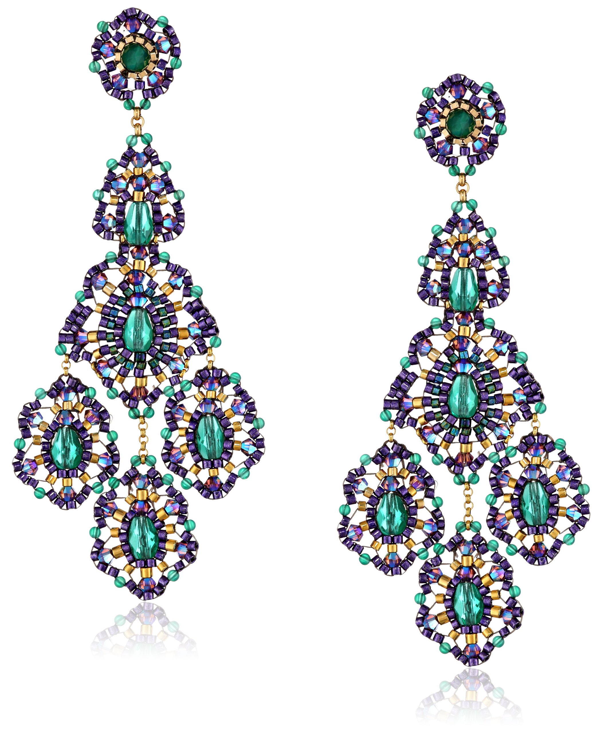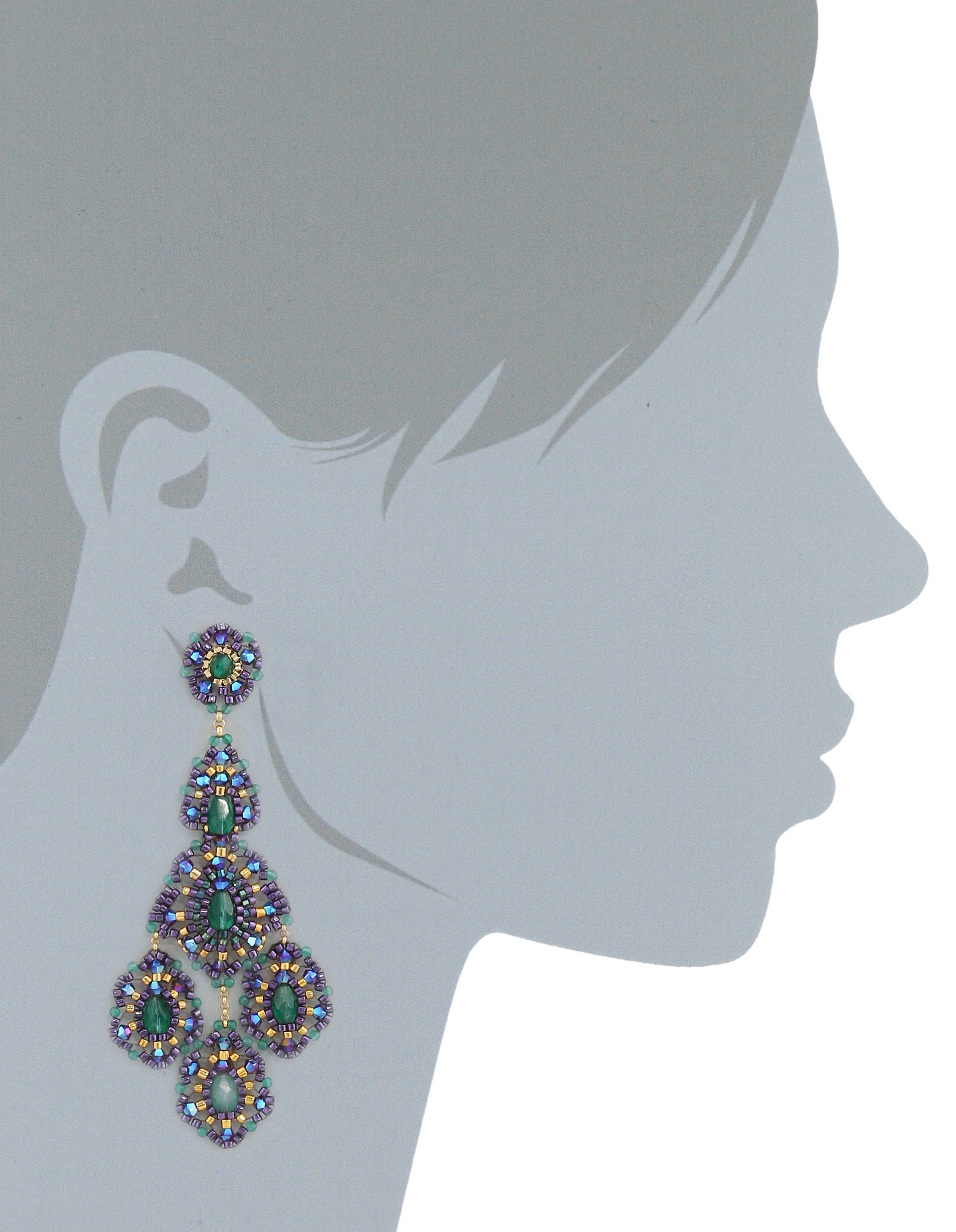 Description Amazon.com The Miguel Ases Green Onyx 14k Gold-Filled Triple-Drop Earrings feature vibrant color for a striking, dramatic look. The earrings feature posts with a green onyx stone in the center that is surrounded by gold, purple, and blue green beads for a pretty spectrum of color. The earrings are designed with two more layers of the same pattern and end with three dangling circles with similar colors and stones. The layers create a bold, eye-catching look and at 3.5 inches long and 1.18 inches long, they make a dashing statement in your ears. The fishhook backings are easy to use and keep the earrings securely in place. The Miguel Ases Story Miguel Ases, Inc. was founded by designer Miguel Ases in 1994. After retiring from the National Ballet of Spain, he was left with a deep craving to create. In 1990, Ases came to New York City and started as head designer at Gaetano Fazio Jewelry. Later, Ases created his own label to showcase his collections. Inspired by the arts, Ases draws from the surreal and abstract. His combination of colors and new silhouettes are eclectic and boldly feminine. Each handcrafted piece is made to complement the wearer's personal style, offering a look that is timeless, classic, and suitable for women of all ages. Through the intricate beading, sparkling crystals, and semiprecious stones, Miguel Ases strives to make the wearer feel effortlessly wonderful.