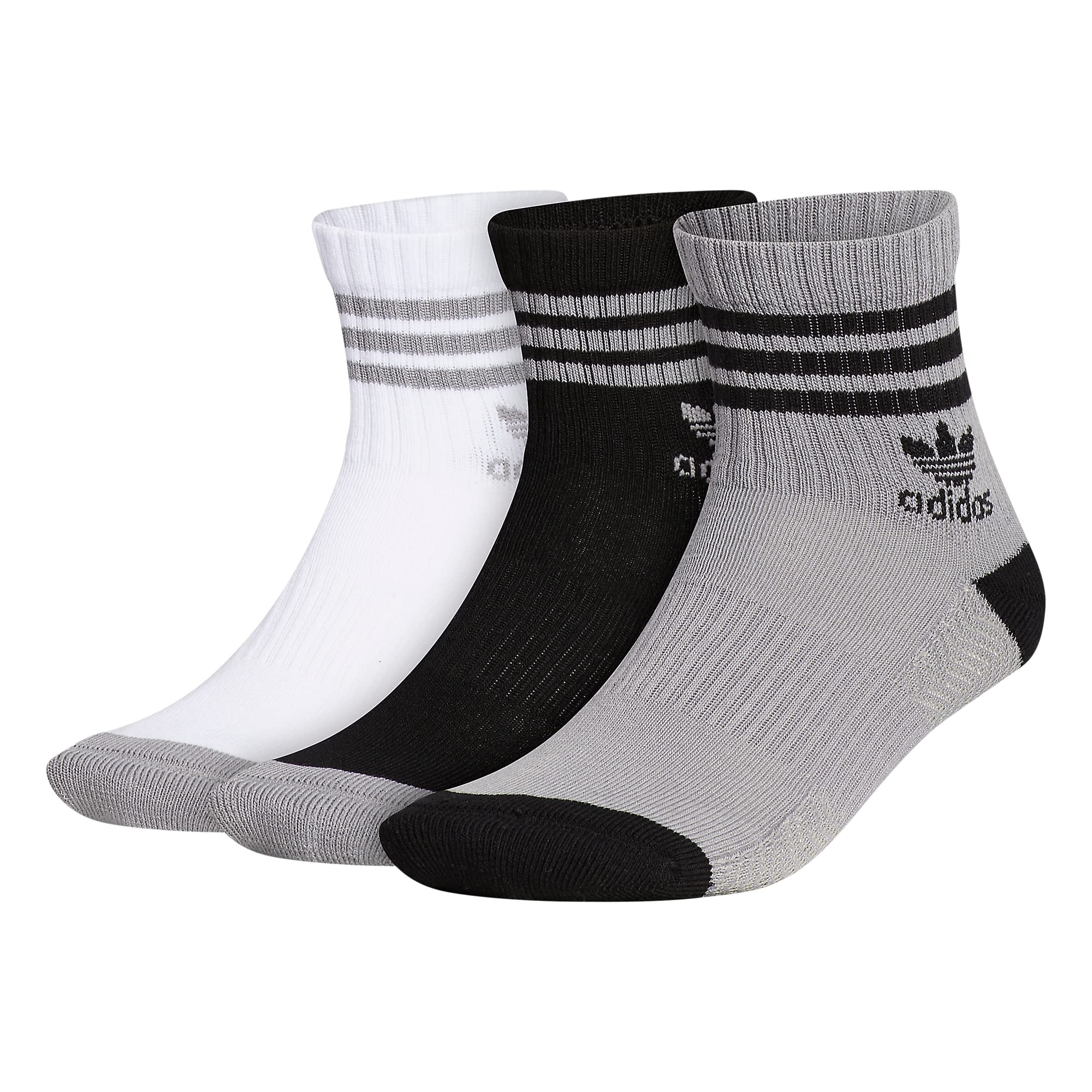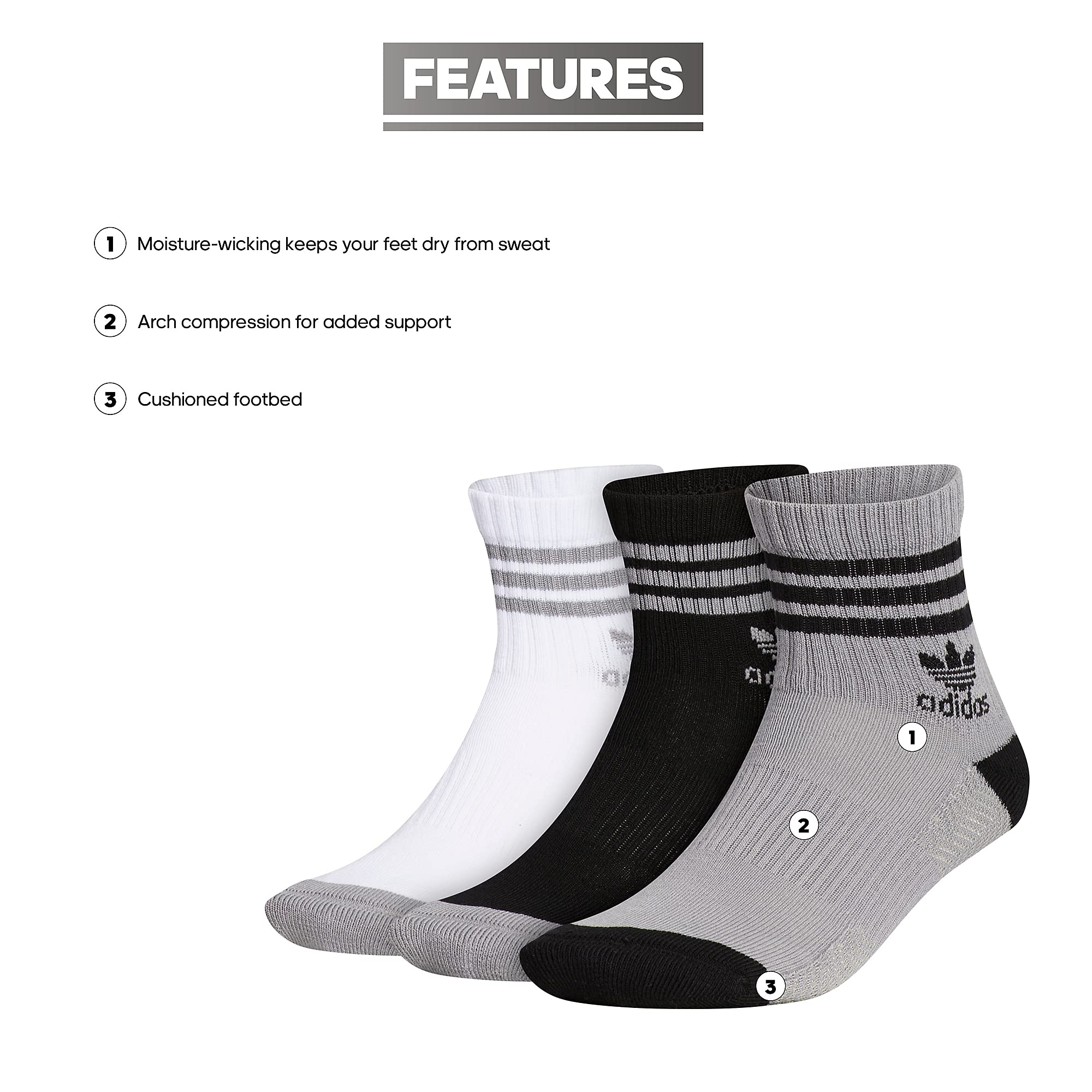 Description If you are looking for a sock that is a little lower than your traditional crew, then the Roller High Quarter is perfect for you. You still get that timeless 3-Stripe design detail, but in the length you prefer. Additional features include cushion in the foot for comfort, arch compression for a secure fit, moisture-wicking to keep your feet dry from sweat, and a traxion footbed inspired by the Superstar tread on the bottom of the shoe.
