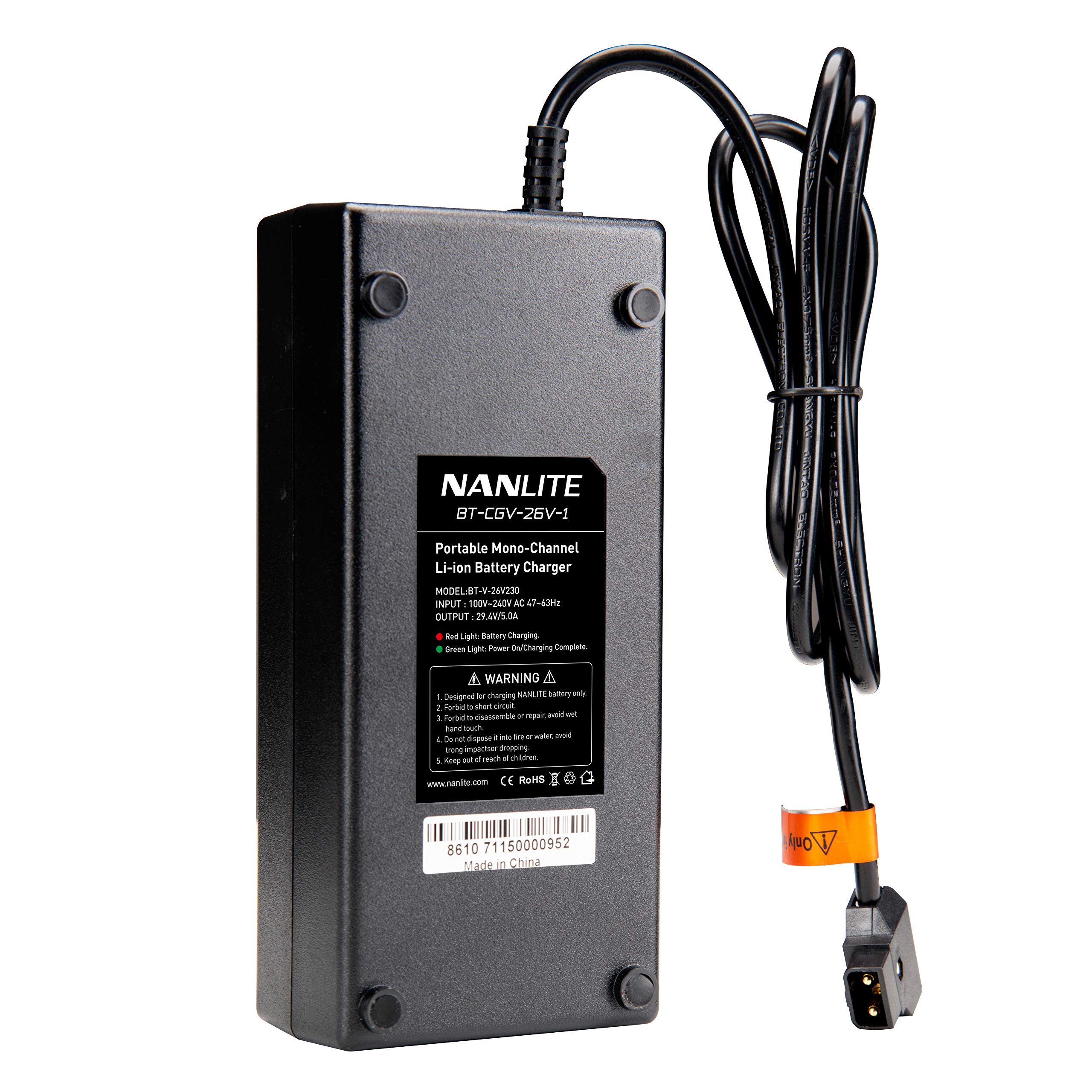 Created specifically to charge Nanlite's line of 26v V-mount batteries, the Nanlite Single 26V V-Mount Battery Charger with D-Tap Output achieves a full charge in 6 hours, 80% in 4.5 hours. Plug it into any 3-prong AC outlet and connect the D-Tap output to the battery's accessory port. An LED indicator remains red while your battery is charging and switches to green when fully charged. Compatible with: Nanlite 26V 230Wh Li-Ion V-Mount Battery (BT-V-26V230) Nanlite 26V 270Wh Li-Ion V-Mount Battery (BT-V-26V270) *Note* Nanlite recommends only using their purpose-built chargers with Nanlite batteries.