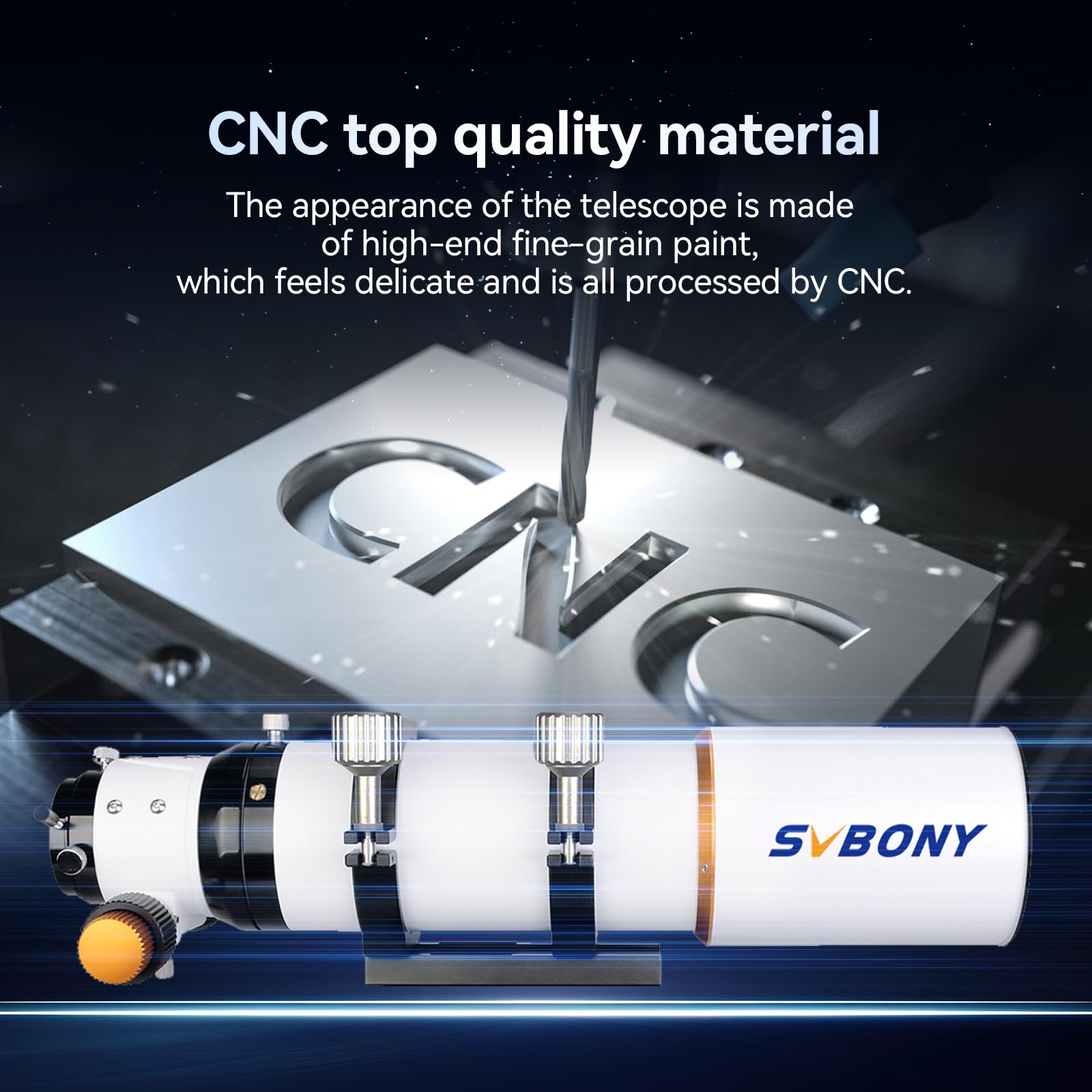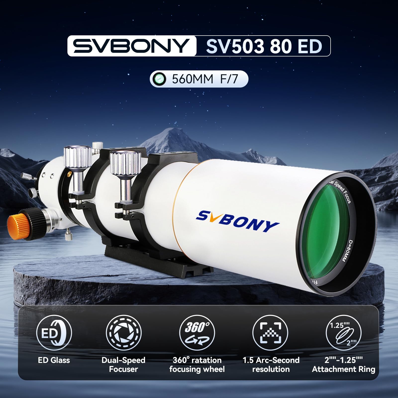 -Strong adaptability;SVbony 80mm ED refractor telescope can be used with SV193 Focal Reducer, SV705C Telescope Camera, SV220 Telescope Filter, SV226 Telescope Filter Drawer for astronomical photography OR be used with SV188P Dielectric Mirror, SV182 Finderscope, SV135 Zoom Eyepiece for astronomical visual observation