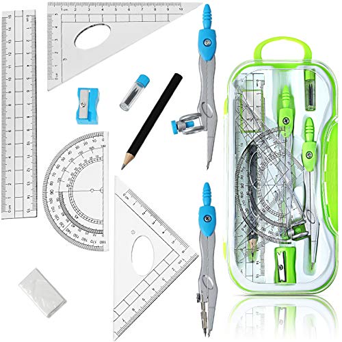 2 Sets math geometry kit, student compasses set including ruler, protractor, compass, eraser, pencil sharpener, pencil, and refills for drawing and engineering drafting, home school supplies Features: Easy to carry: Each student compass set is matched with a durable plastic box, which can protect and store the tools in the backpack, drawer or bookcase. Compact in size and light in weight, this compass set is very easy to carry, suitable for home, school, office and outdoor sketching. Practical tool: Not only can the pencil be applied for writing and drawing, but it can also be placed in the compass holder to help you easily draw a complete circle. No need to change its internal line, the operation is simple and fast. Specifications: Color: as pictures shown Material: metal, plastic Package includes: 1 x Plastic box 2 x Compasses 2 x Triangle rulers 1 x Straight ruler 1 x Protractor 1 x Pencil for compass 1 x Eraser 1 Bottle refills Notes: Manual measurement, please allow slight errors on size. The colors may exist slight difference due to different screens.