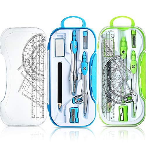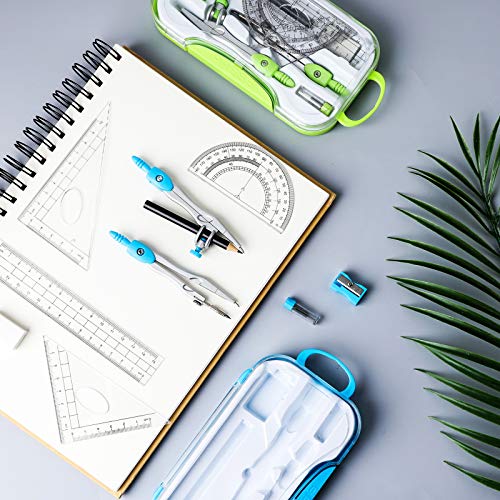 2 juegos de kit de geometría matemática, 10 piezas por juego de brújulas para estudiantes, que incluyen regla, transportador, brújula, borrador, sacapuntas, lápiz y recambios para dibujar, material escolar para el hogar (verde, azul)