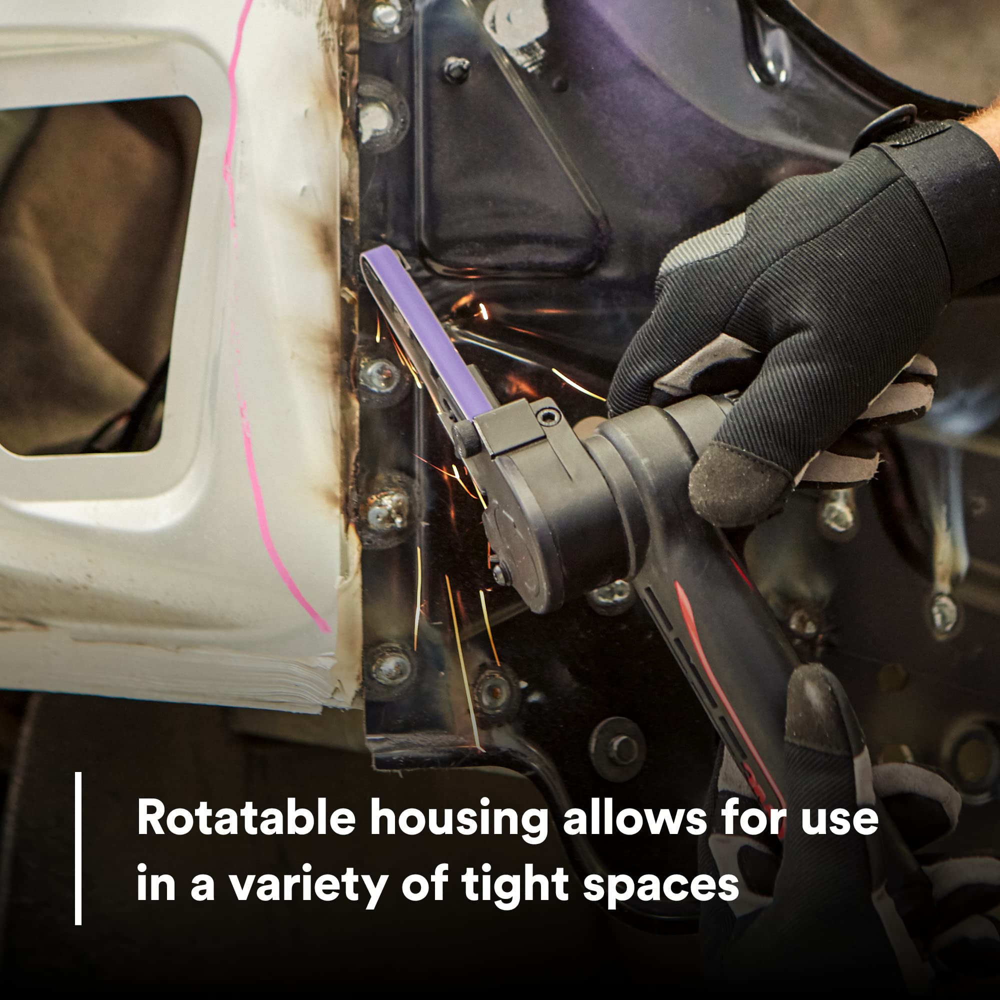 Use the 3M File Belt Sander for Body Repair to bring the reliability and versatility of heavy-duty file belt sanders for metalworking into the collision repair shop. This 3M File Belt Sander features a light weight and a narrow profile that makes it ideal for automotive work. It operates at 495W (0.65 HP) and weighs less than 1 kg (2 lbs) - plenty of power and excellent manoeuvrability for a range of jobs including spot weld removal. In many cases, the belt sander can replace a traditional spot weld drill. It is also great for efficient hem flange removal, surface prep, urethane, seam sealer and weld clean-up. The 3M File Belt Sanders for Body Repair is especially suitable for sanding or grinding in tight areas such as between door panels or along sharp contours. The entire housing is rotatable, enabling the operator to turn and rotate the sander and the belt for hard-to-reach areas. This file belt tool is designed for use with 3M Cubitron II Abrasive Belts, created for performance grinding and long abrasive life. It features a replaceable rubber contact wheel that is designed to provide added flexibility and exert less pressure on the abrasive during use, further lengthening the life of the abrasive belt. Our 3M File Belt Sander for Body Repair is part of a complete portfolio of abrasives and tools specifically designed for refinish repair.