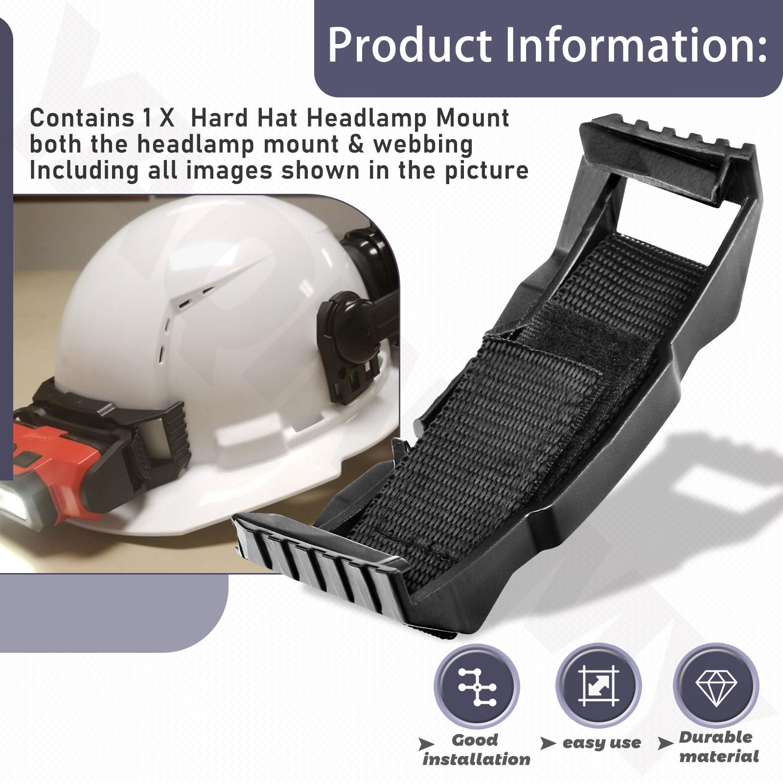 -Product Information: Contains 1 X Hard Hat Headlamp Mount, both the headlamp mount & webbing, Including all images shown in the picture.