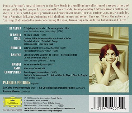 Admired for her remarkable creative imagination and exemplary musicianship, soprano Patricia Petibon, in her newest album for Deutsche Grammophon, offers a treasure-trove of fascinating Baroque curiosities guaranteed to enthrall both the Baroque aficionado and the casual listener. Nouveau Monde is conceived as a journey from the Old to the New World, a spell-binding collection of arias, songs and pieces from European composers (Charpentier, Handel, Rameau, Purcell) that testify to their composers fascination with the exoticism of recently-discovered lands, as well as South American folksongs which boast exceptional rhythmic energy and colour. Spectacularly accompanied by the La Cetra Baroque Orchestra under the excelling direction of Andrea Marcon who also stands out as a Baroque organist and harpsichordist - Patricia enchants our senses with a melange of 17th-century arias and folk songs from England, France, Spain, and Latin America. Some of the numbers feature guest instrumentalists whose additions of unique and surprising strokes of colour enhance Patricia Petibons revelations of the expressivity of this past era.