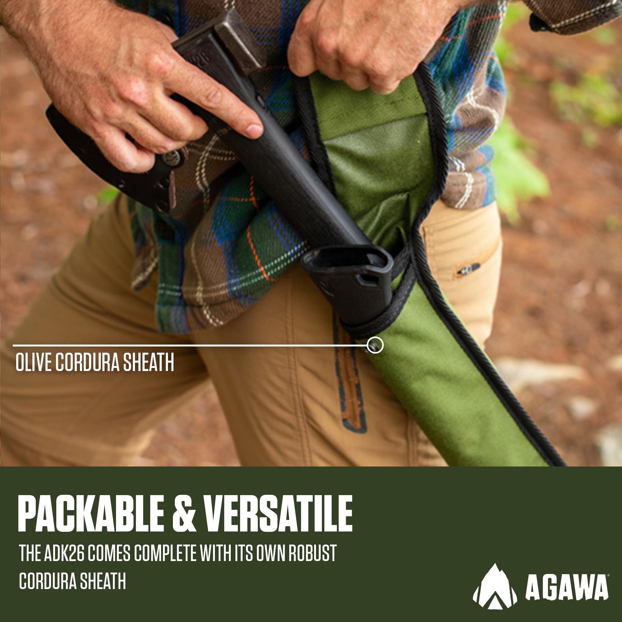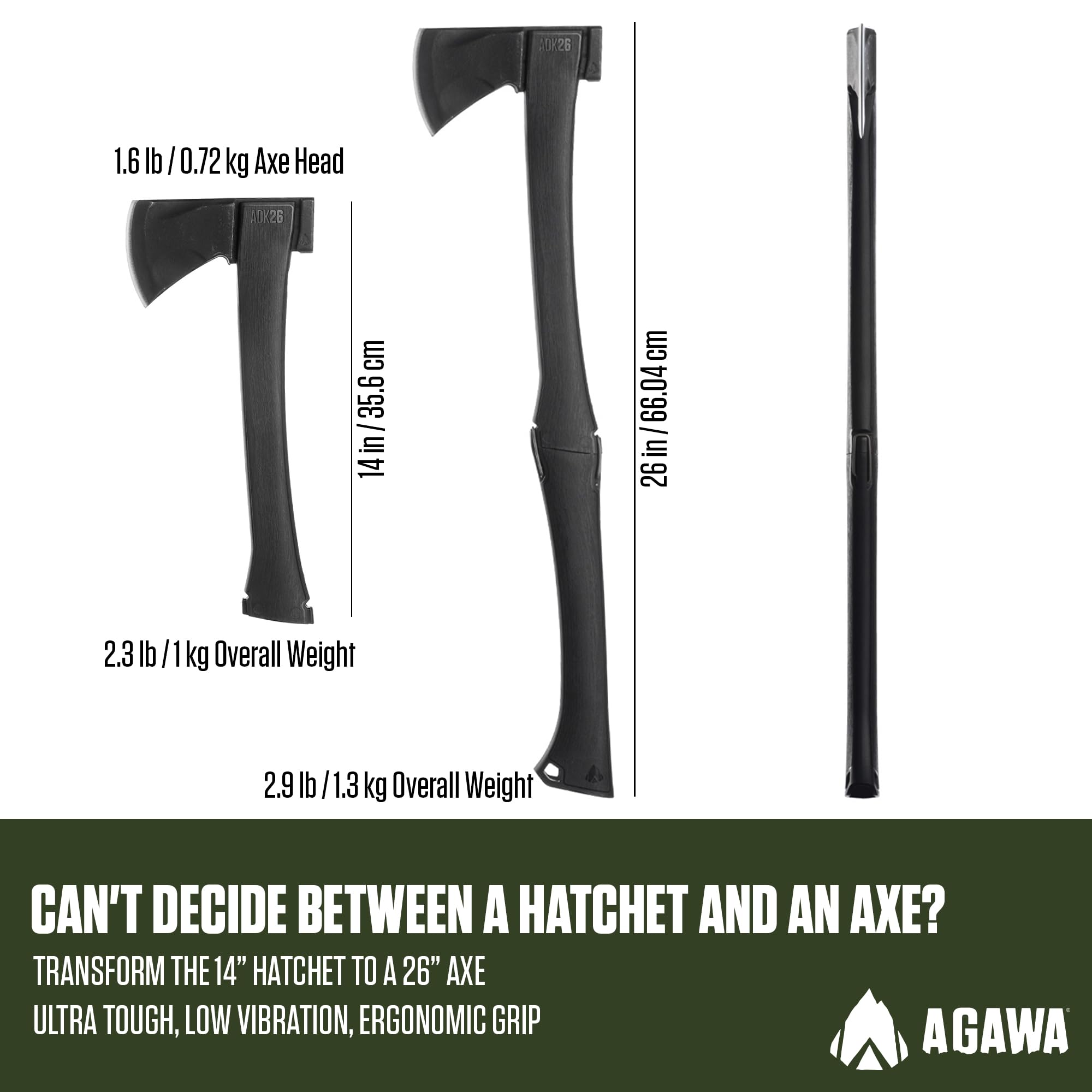 AGAWA ADK26 Transforming Hatchet & Camping Axe Can’t decide between a hatchet and an axe? The ADK26 transforms from a 14” hatchet to a 26” forest axe in seconds with a rock-solid compression joint with zero wobble. The secret lies in our compression joint between the two parts. It ensures absolute stability with no wobbling or movement. The stainless steel clips keep the ADK26 securely locked together, eliminating any risk of separation. When you’re finished, just disconnect the handle and pack everything into one compact Cordura sheath. We know that Mother Nature can be tough, so we've built the ADK 26 to withstand the harshest conditions. It features an impact-modified, long-fibre nylon handle that’s ultra-tough, low vibration, and comfortable to grip thanks to its ergonomic wood-grain texture. The ADK26’s drop-forged 5160 carbon steel head features a Scandinavian-style bit for carving, shaping, and creating feather sticks. The wide cheeks on the full-length head provide the power and configuration to deliver serious log-splitting force and handle larger tasks. The ADK26 comes complete with its own robust Cordura sheath, ingeniously designed to house all its components until the moment they're needed. When it's time for lighter duties, effortlessly slide out the hatchet; conversely, keep the extension handle discreetly tucked away for those times when you require additional strength.