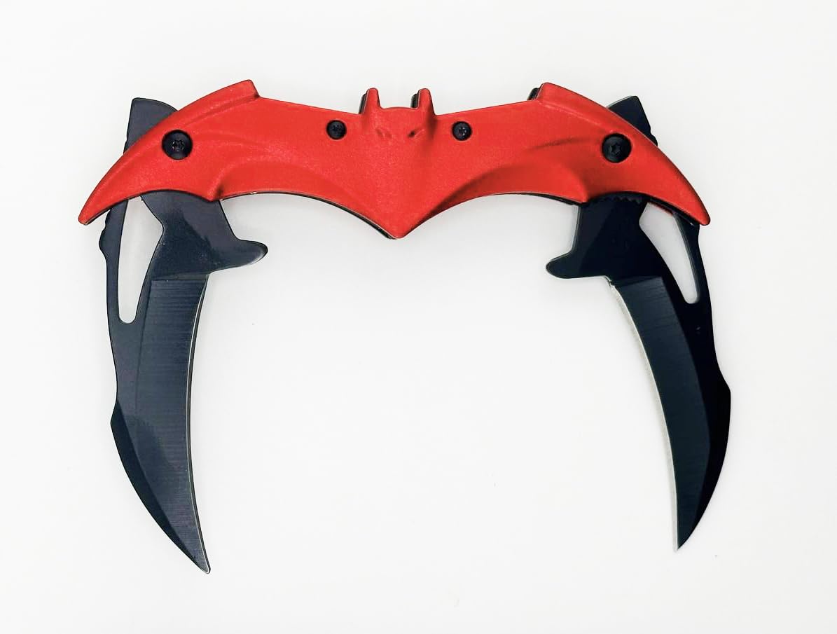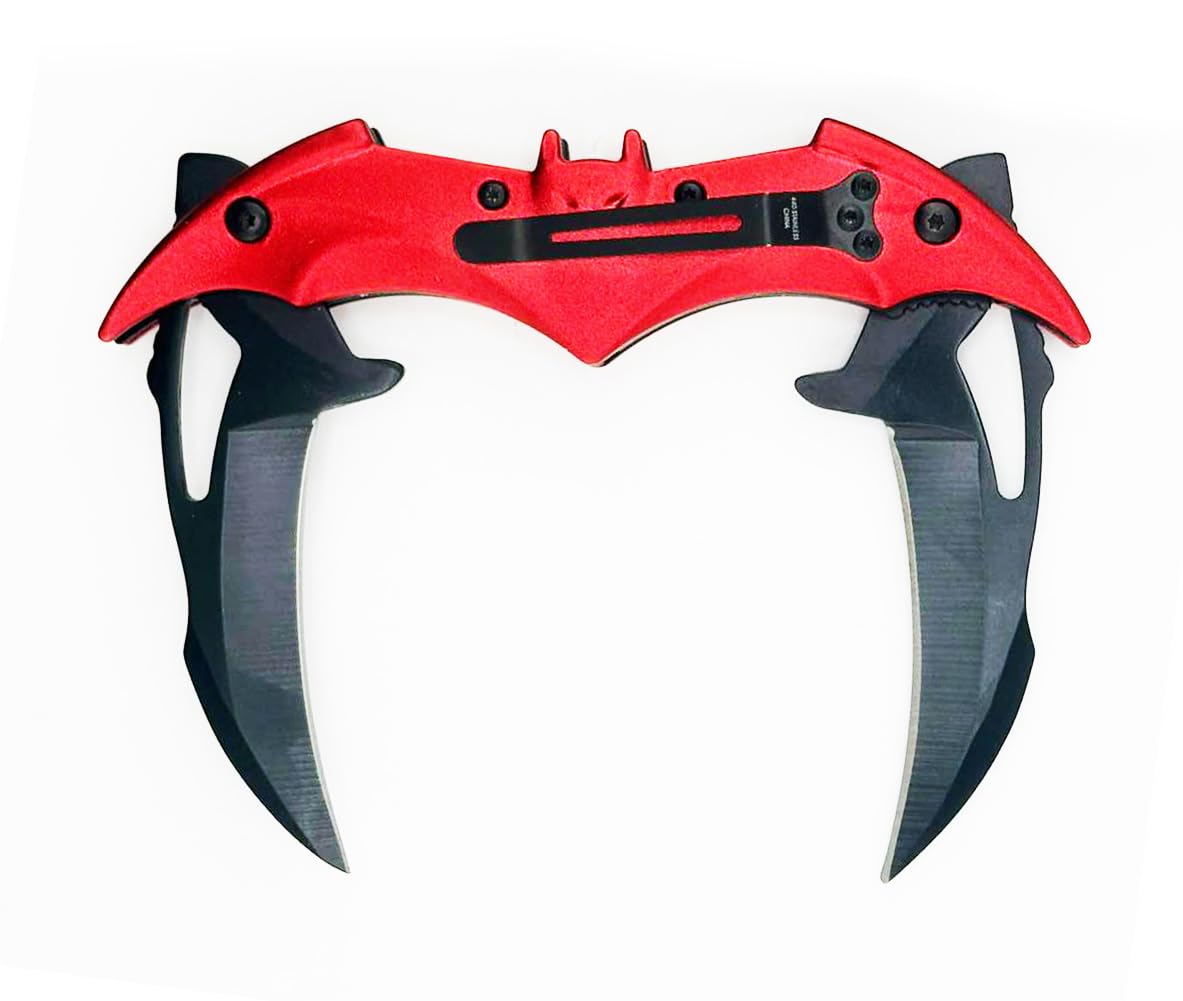 Twin Blade Knife - 11" Pocket Folding Spring Assisted Dual Blades Bat Knife - A Cool and Tactical Knife for Men, Perfect as a Gift or for Your Own Pocket Knife Collection! This Bat-inspired pocket knife features twin blades, each measuring 2 5/8 inches and made of 440 stainless steel, and a body made of anodized aluminum for durability and a sleek look. Its spring assisted mechanism ensures easy and quick deployment of the blades, making it a practical tool for everyday carry. Whether you're a fan of pocket knives, folding knives, or tactical knives, this spring assisted pocket knife is sure to impress. It's a cool and stylish addition to any collection, and makes a great gift for any comics fan or knife enthusiast. Don't miss out on this Bat Twin Blade Knife - get yours today!