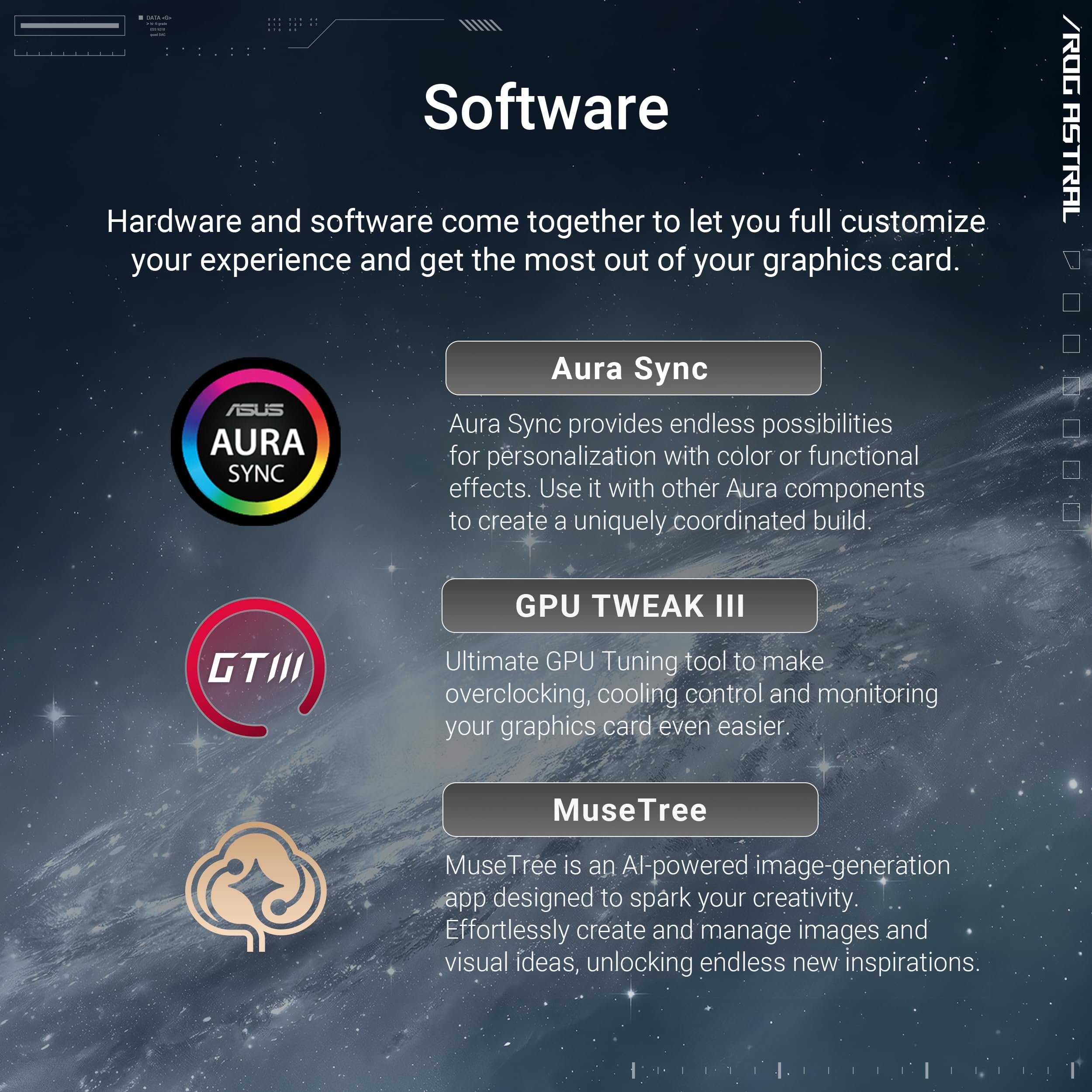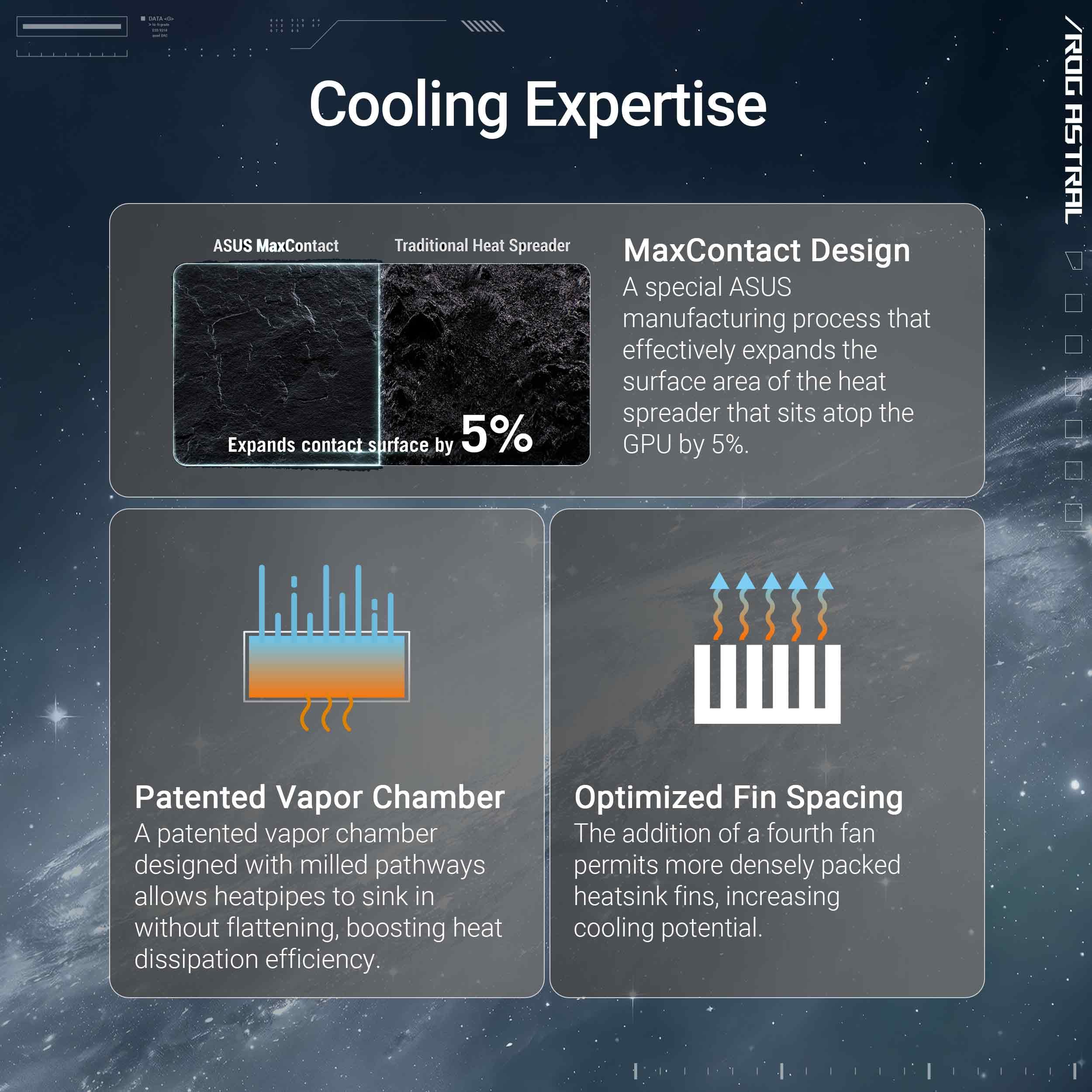 The ASUS ROG Astral GeForce RTX™ 5080 White OC Edition introduces ROG's first quad-fan graphics card, coupled with a patented vapor chamber, increased heatsink fin density, a phase-change GPU thermal pad, towering default clock speeds, boosted power delivery, and more. These premium innovations – amplified by an eye-catching die-cast frame and metal GPU bracket – combine to deliver absolute performance that can handle even the most demanding gaming scenarios.