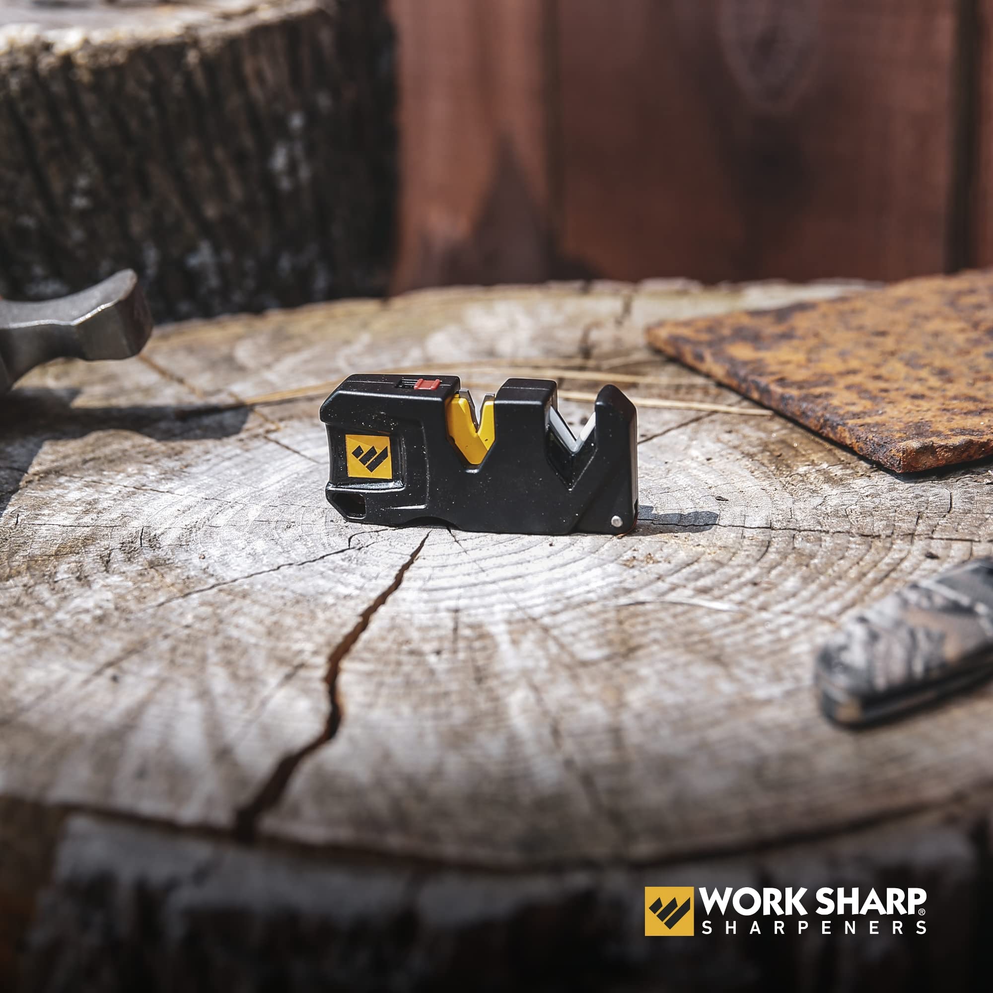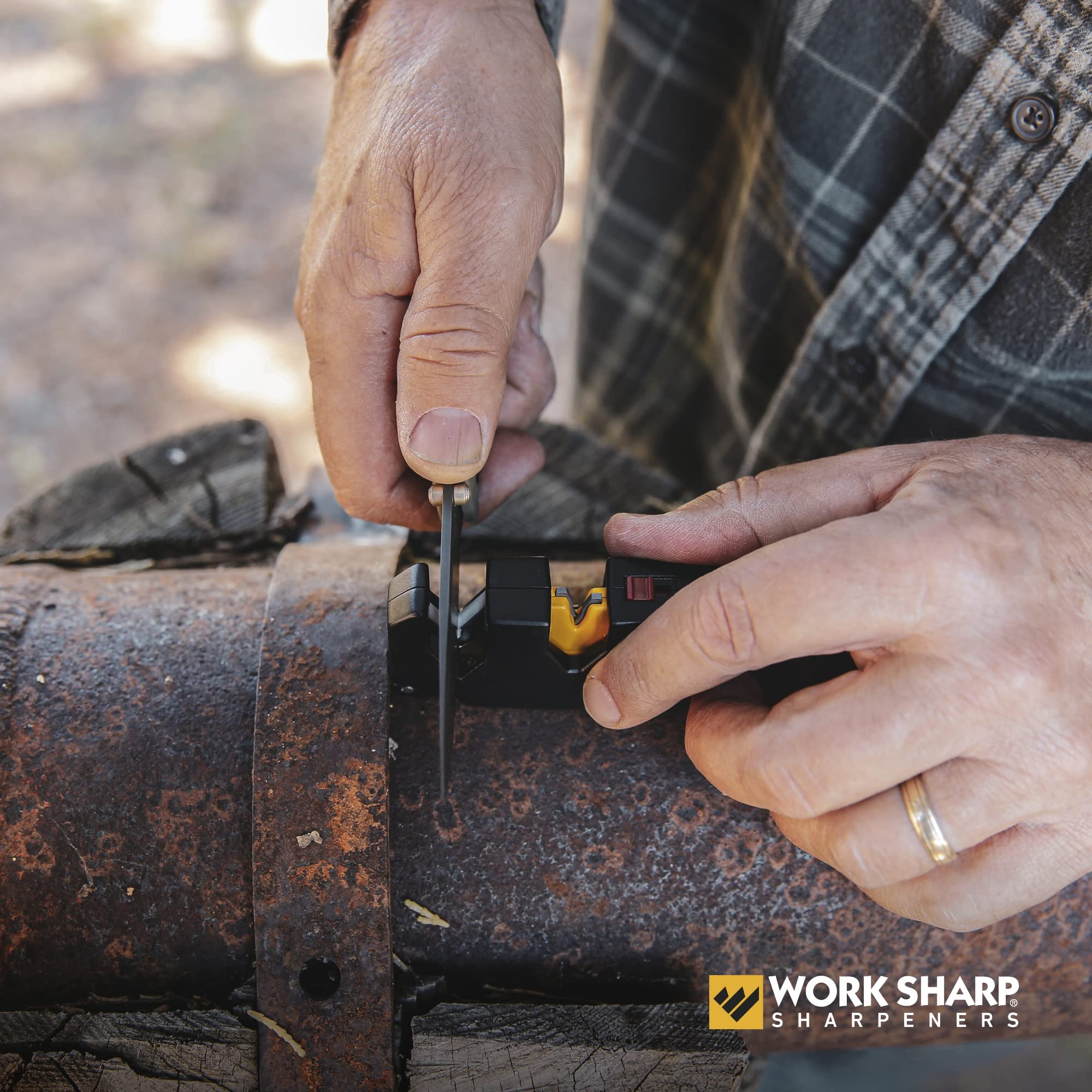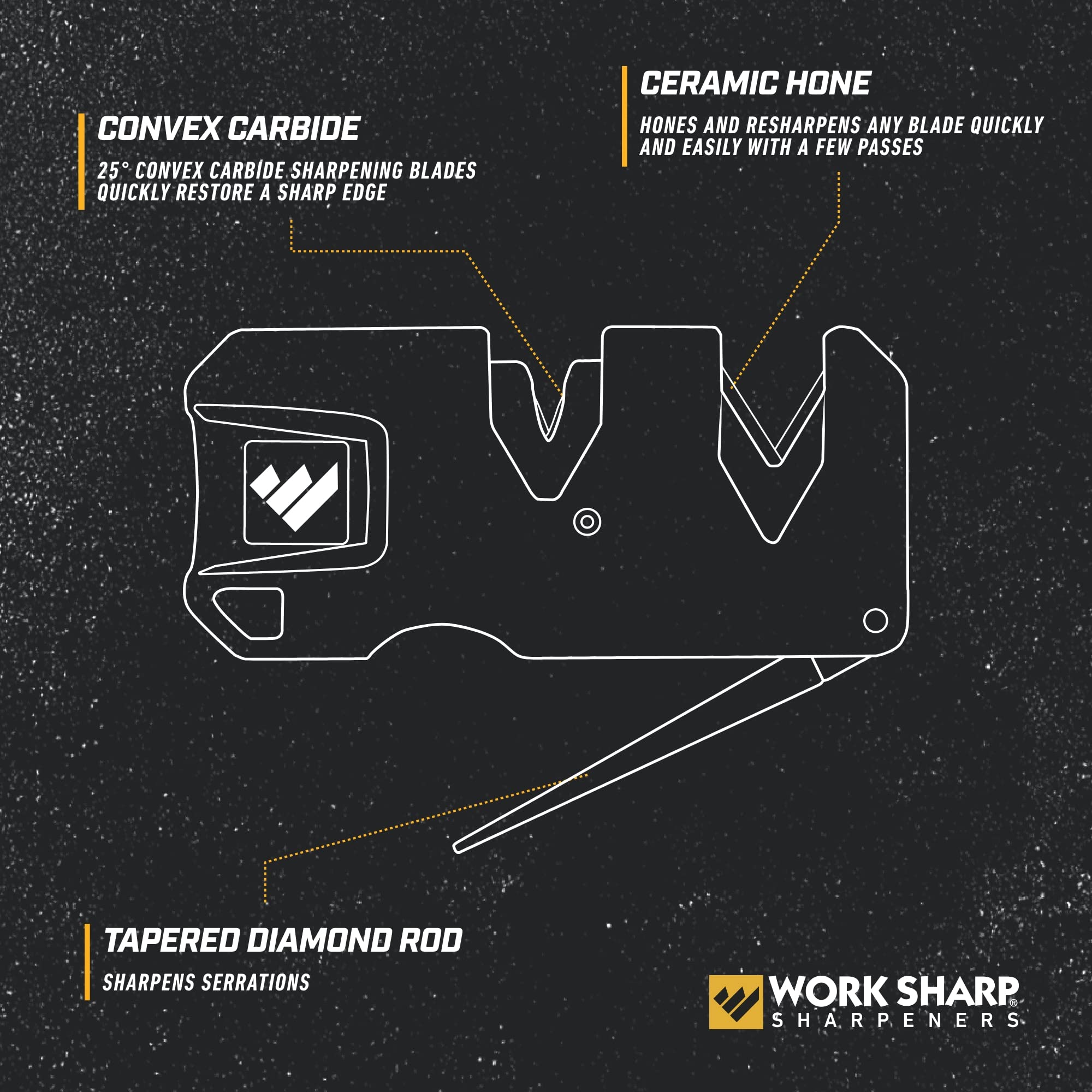 The Work Sharp EDC Pivot PLUS Knife Sharpener is a fast, easy and effective way to sharpen any knife you own. Convex Carbides quickly restore a sharp edge; while the fine grit ceramic rods hone the edge to factory level sharpness. Pivot Response follows the curve of the blade when sharpening making it easier and more consistent. Tapered Diamond Rod is ideal for touching up serrations or fine edge tools and has a groove for sharpening fishhooks. Compact size easily stows in your pack, pocket, tool or tackle box.