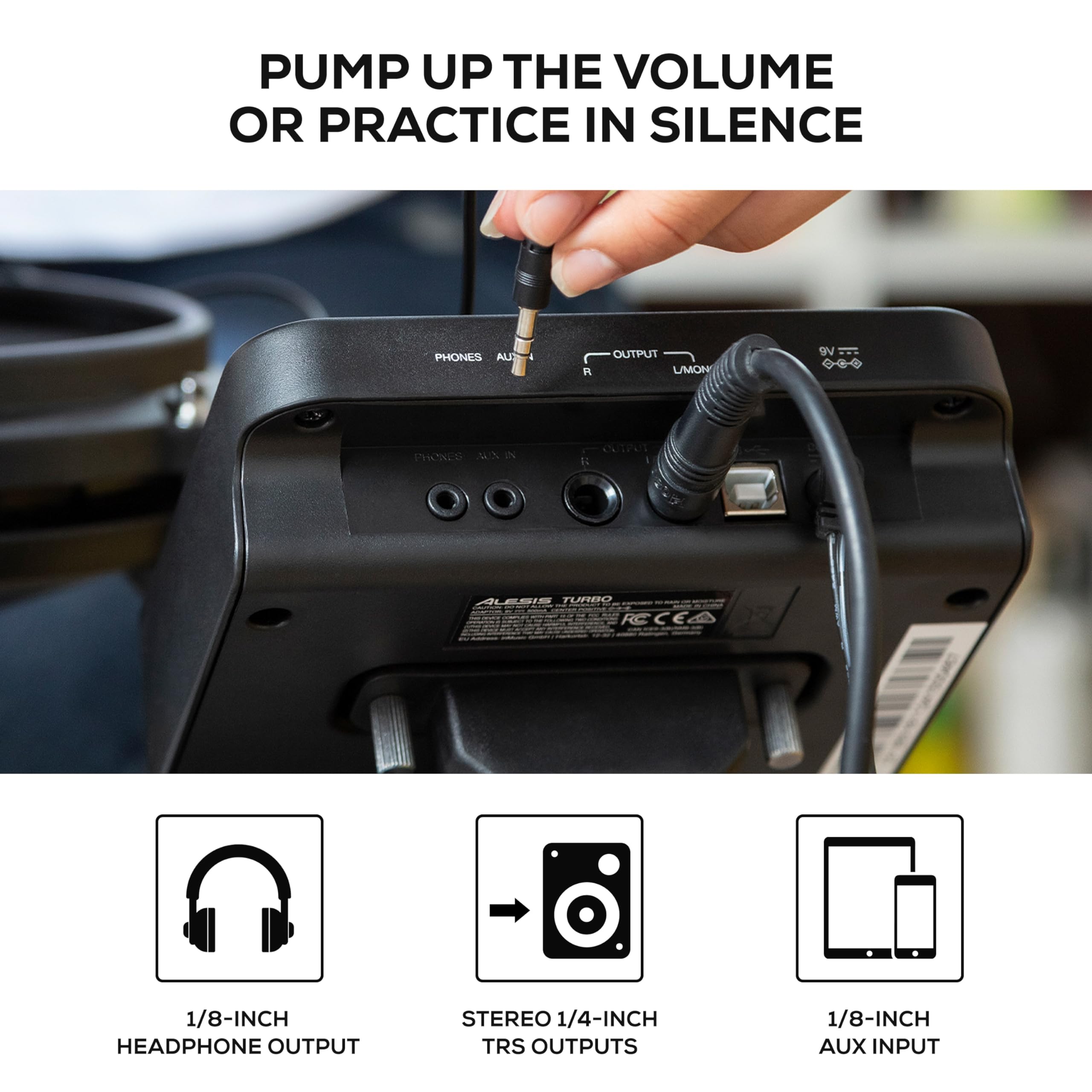 The Ultimate Kit for Supercharged Performances Introducing the Alesis Turbo Mesh Kit! Delivering the ultimate playing experience with genuine skin-like rebound, our exclusive mesh heads are providing an uncompromising natural feel and ultra-quiet response - ideal for late-night practice and the perfect solution for aspiring drummers. The Turbo Drum Module is loaded with in-demand percussion sounds, ready-to-play kits and play-along tracks. Everything You Need Right out-the-box, the Turbo Mesh Kit guarantees to get you playing fast, including cabling, drum key, even drumsticks! With Turbo Mesh’s USB-MIDI port, transmit MIDI information directly to a computer and unite your synthesizer, drum machines and more for expanded performance potential, plus, utilize the Turbo Mesh Kit’s handy headphone output for ultra-quiet practice. Sound Matters Alesis Turbo Mesh Kit features 100+ drum and cymbal sounds, expertly curated into a collection of 10 ready-to play kits, as well as 30 built-in play-along tracks, drum coach and metronome. 100 Bonus Drum Lessons from Melodics Alesis & Melodics have teamed up to bring Alesis customers 100 bonus lessons when you register your drum kit. Fusing an engaging, fun interface and instant feedback, Melodics guarantees to get you playing better right from the get-go!