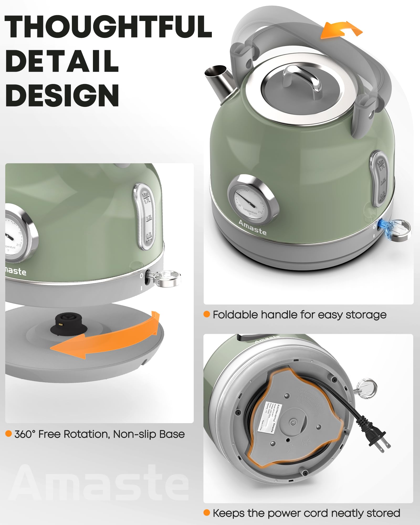 Amaste Hervidor eléctrico, hervidor de té eléctrico retro con termómetro, hervidor de agua caliente de 57 onzas para café y té, acero inoxidable 304, ebullición rápida de 1500 W, apagado automático y protección de ebullición en seco, verde Matcha