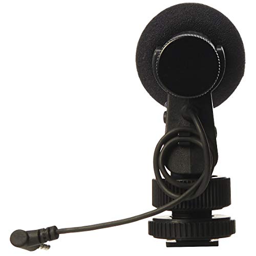 - On-camera microphone with two electret condenser capsules (cardioid and hypercardioid); ideal for capturing audio when taking videos - Works with any recording device equipped with a 3.5mm audio jack, including camcorders, point-and-shoot cameras, and entry-level DSLR cameras - 2 electret condenser capsules; 50Hz - 20kHz frequency range; sensitivity of -35dB3dB(0dB=1V/Pa 1kHz); equivalent noise level: > 55dB at 1KHz - No software necessary; runs on a single CR2 battery (included); camera mount included - Measures 133 by 30 by 71mm; weighs 60g; An Amazon Brand