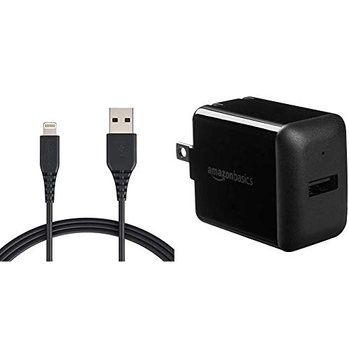 AmazonBasics Cable Lightning a USB A, cargador de iPhone certificado MFi, negro, 6 pies, paquete de 2 paquetes con cargador de pared USB de un puerto de AmazonBasics para teléfono, iPad y tableta, 2.4 A, negro