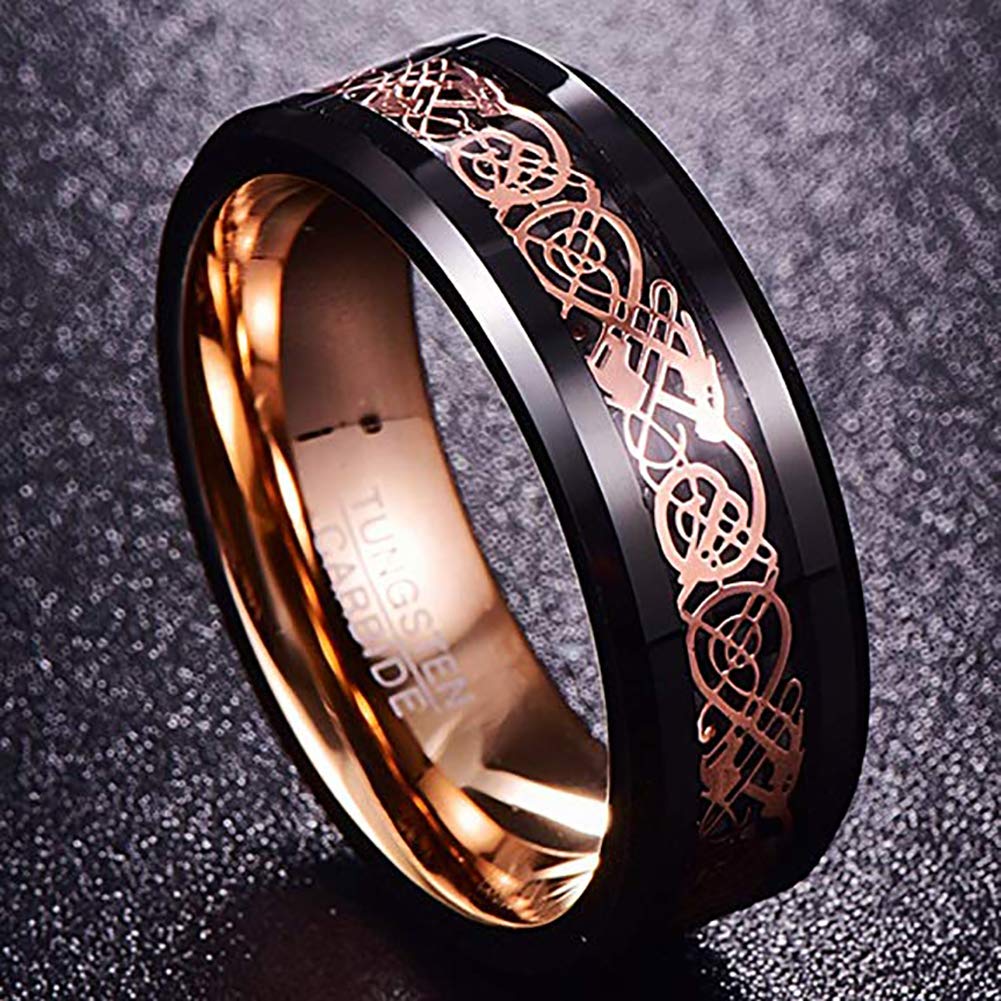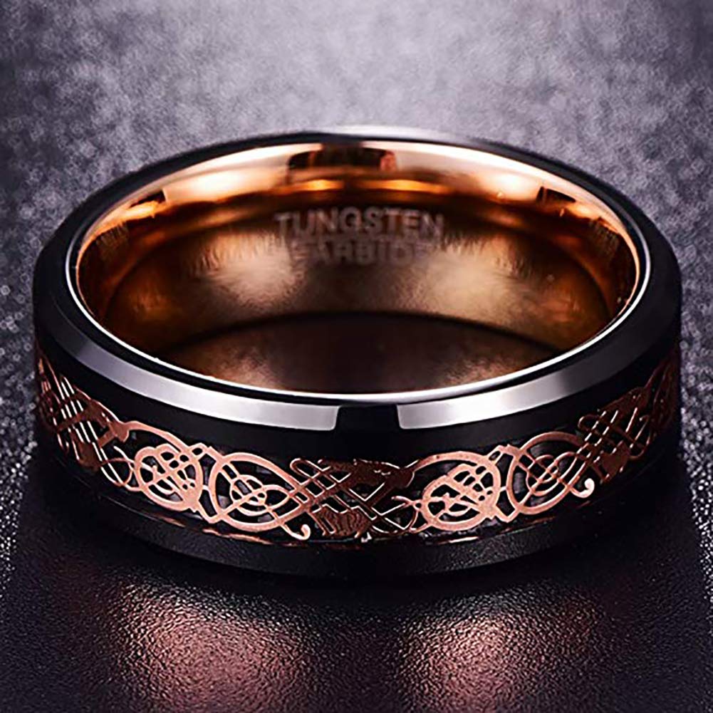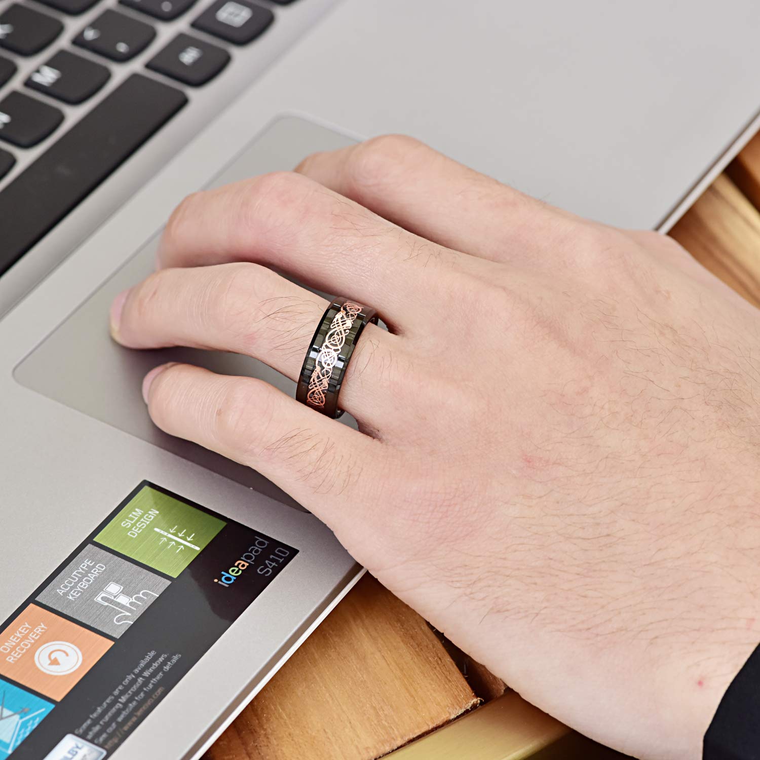 Anillo de compromiso de carburo de tungsteno negro NUNCAD para hombre, anillo de tungsteno celta, incrustaciones de dragón celta de oro rosa, acabado pulido, tamaño 12,5