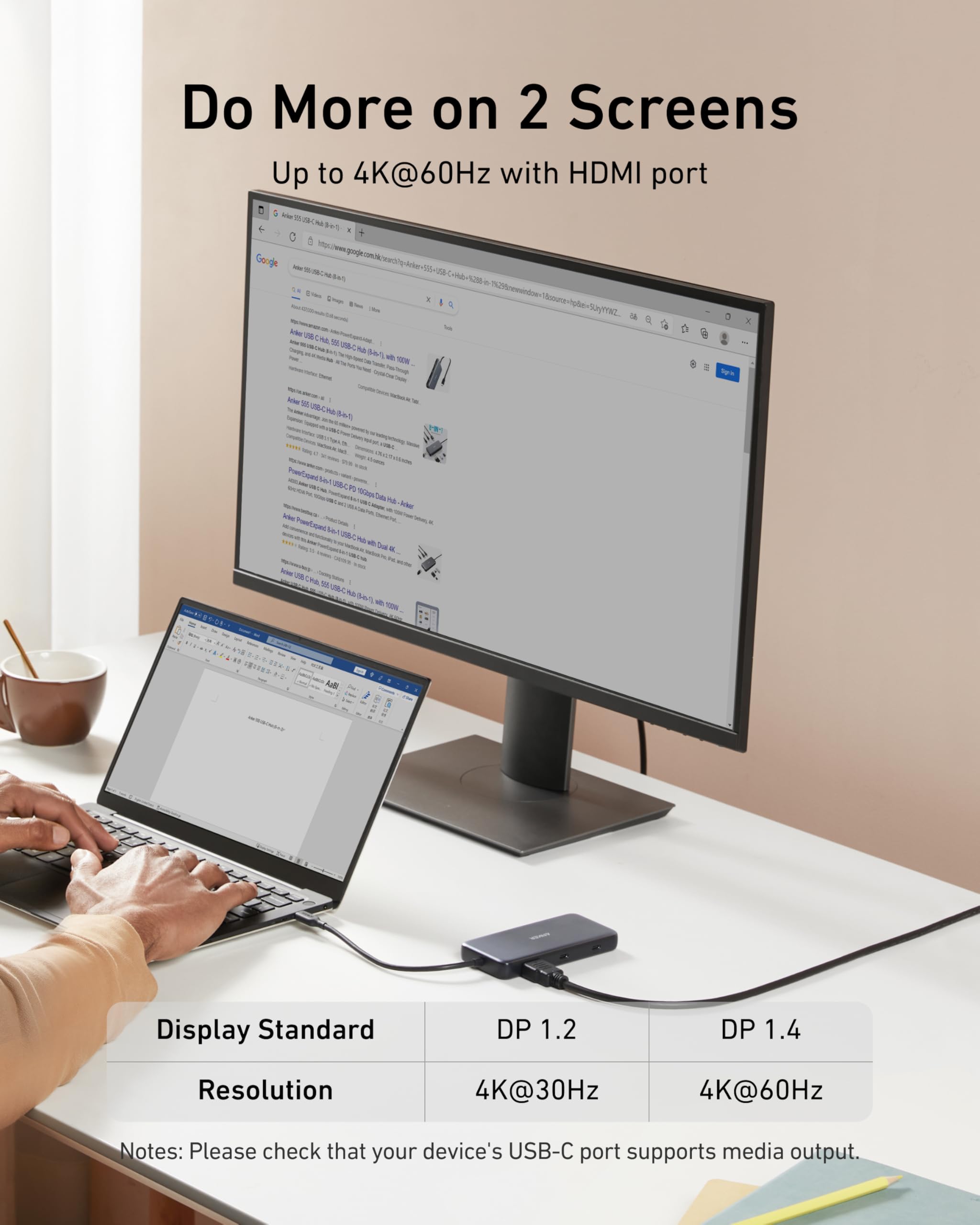 -High-Speed, High-Def: USB-C and USB-A data ports provide file transfer at speeds up to 10 Gbps, while an HDMI port supports media display at resolutions up to 4K@60Hz for DP 1.4 laptops, or 4K@30Hz for DP 1.2 laptops.