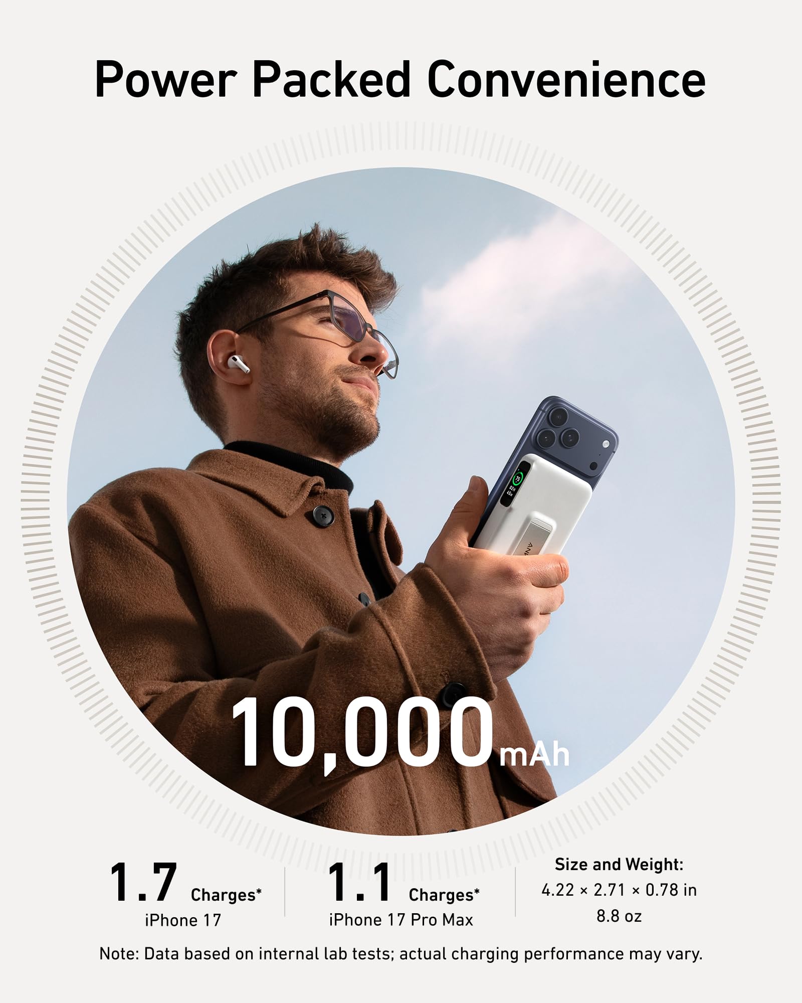 Anker MagGo Power Bank, cargador portátil ultrarrápido compatible con MagSafe de 15 W con certificación Qi2, paquete de batería de 10,000 mAh con pantalla inteligente y soporte plegable, solo para iPhone 16/15/14/13 (cable USB-C incluido)