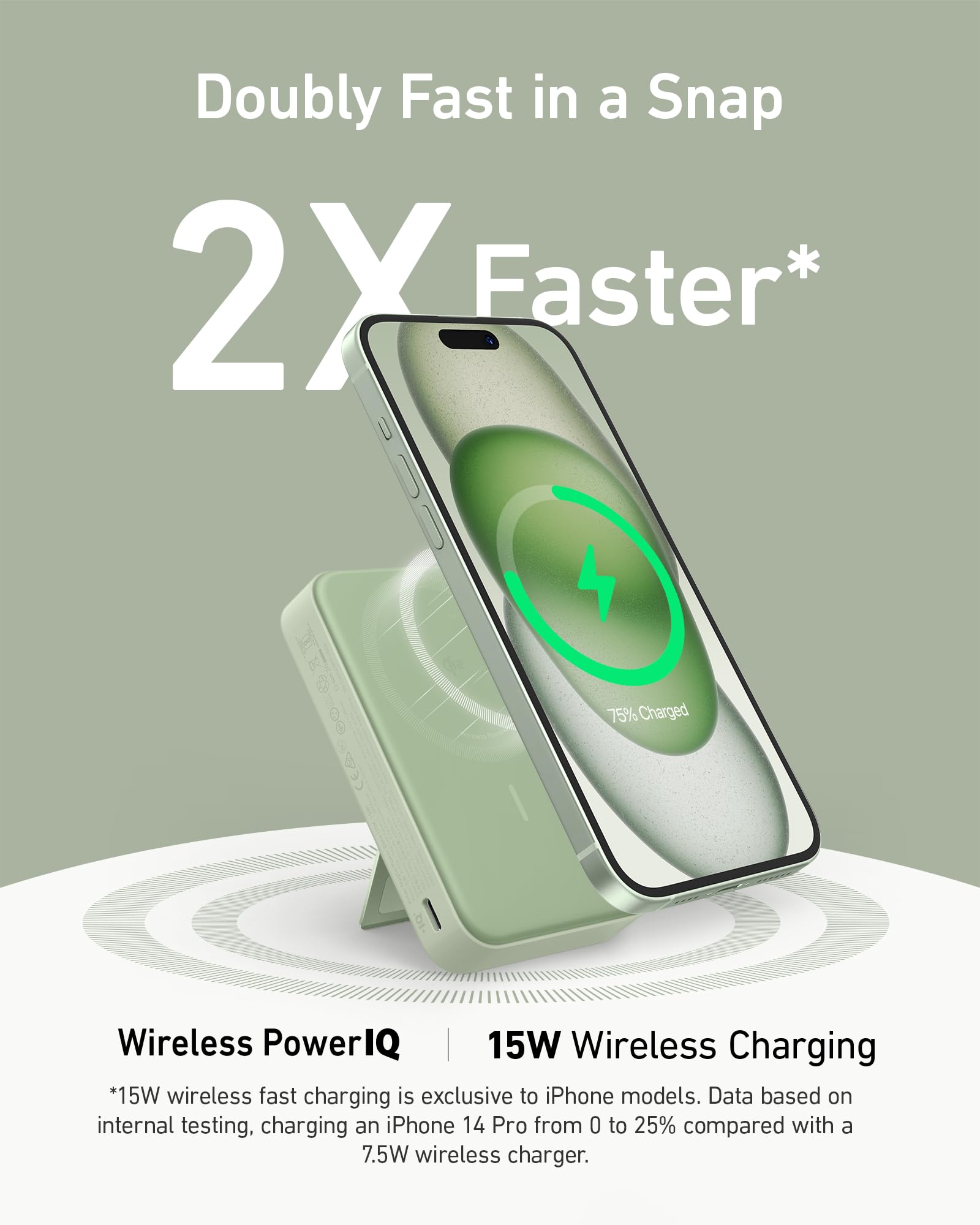 -Double Up on Speed: Enjoy 15W ultra-fast wireless charging and power up your devices 2X faster*. Get your iPhone 15 from 0 to 50% in just 44 minutes.