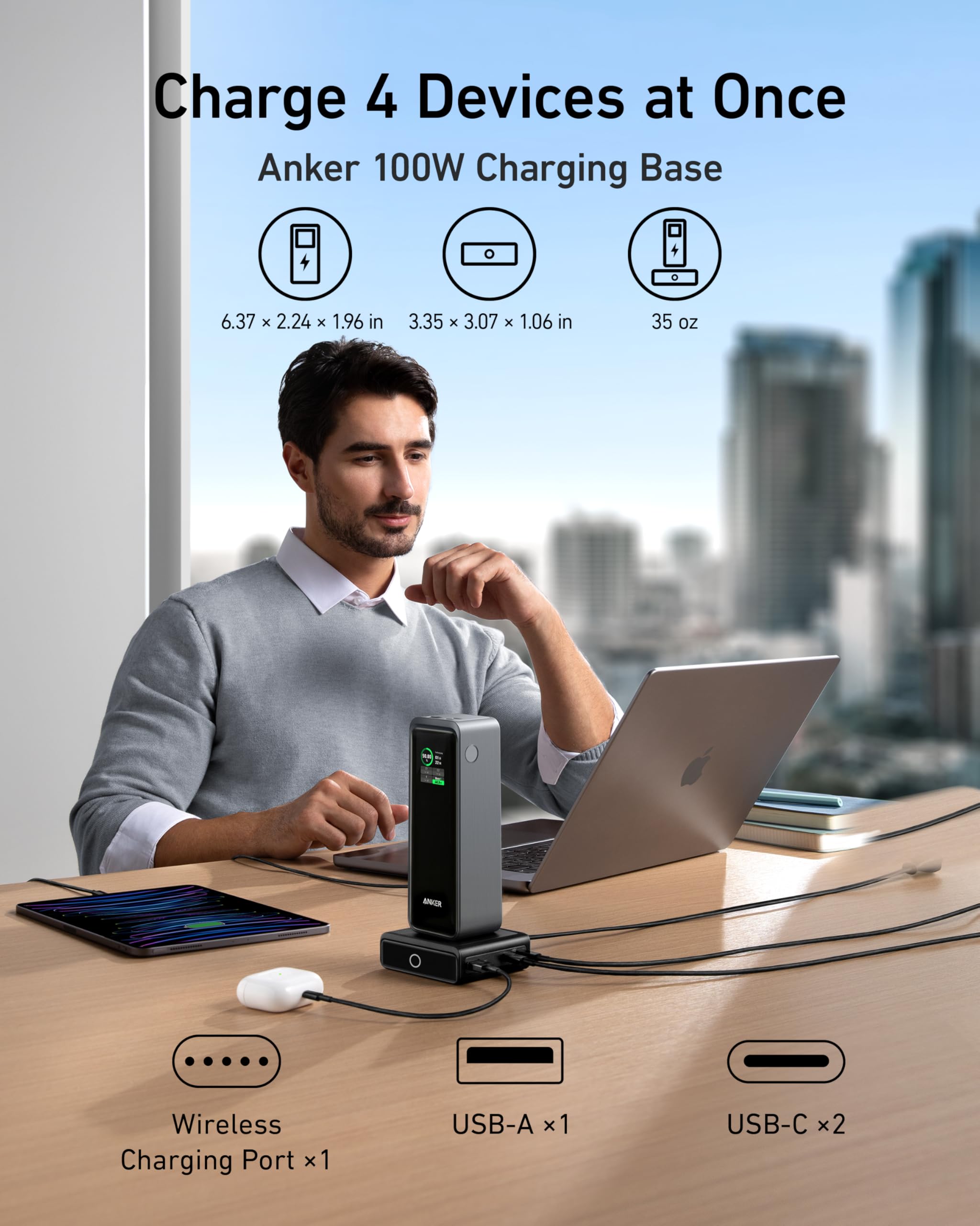 -170W Fast USB-C Recharge: Recharge your power bank at lightning speed with the convenience of dual USB-C ports, allowing you to fully replenish it in just 37 minutes. Note: When the power bank is fully depleted (screen inactive), the base charging will automatically shut off. Please recharge via the USB-C port first to restore base charging functionality.