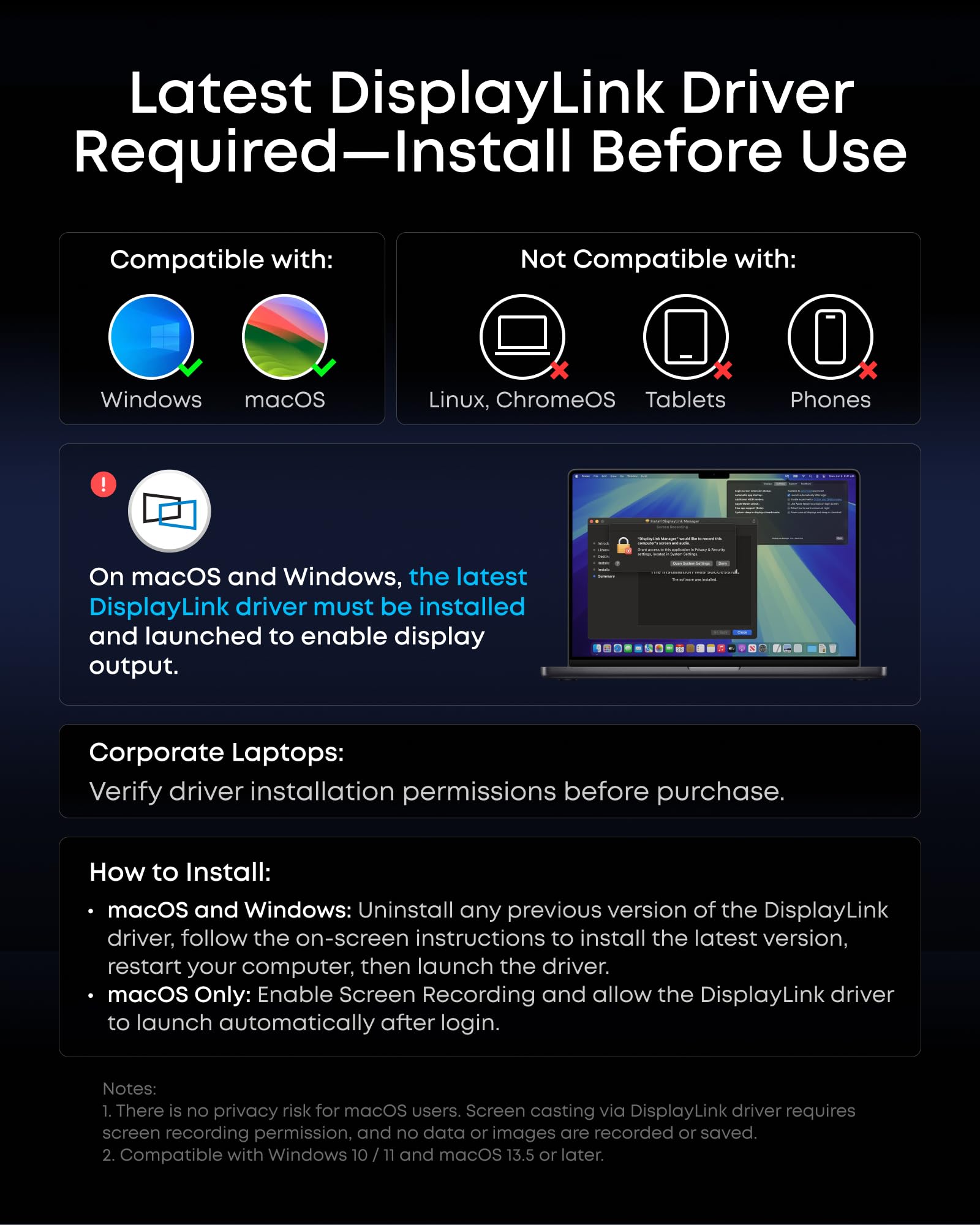 -One 8K Output, Triple Display Versatility: Power up three external monitors at once, including one in 8K, for ultra-efficient multitasking. Compatible with both MacOS 13.5 or later and Windows 10/11.(Note: The latest DisplayLink driver installation is required.)