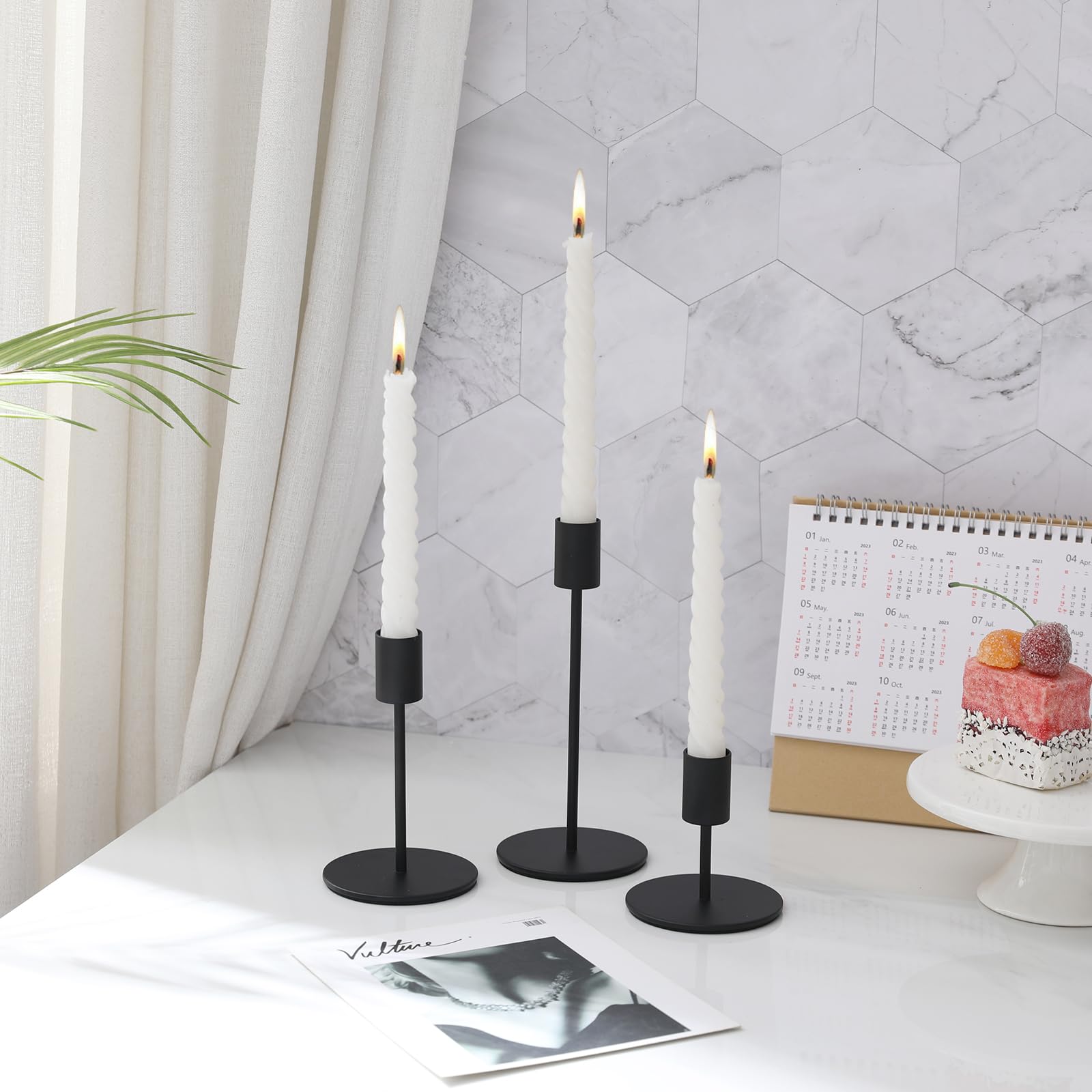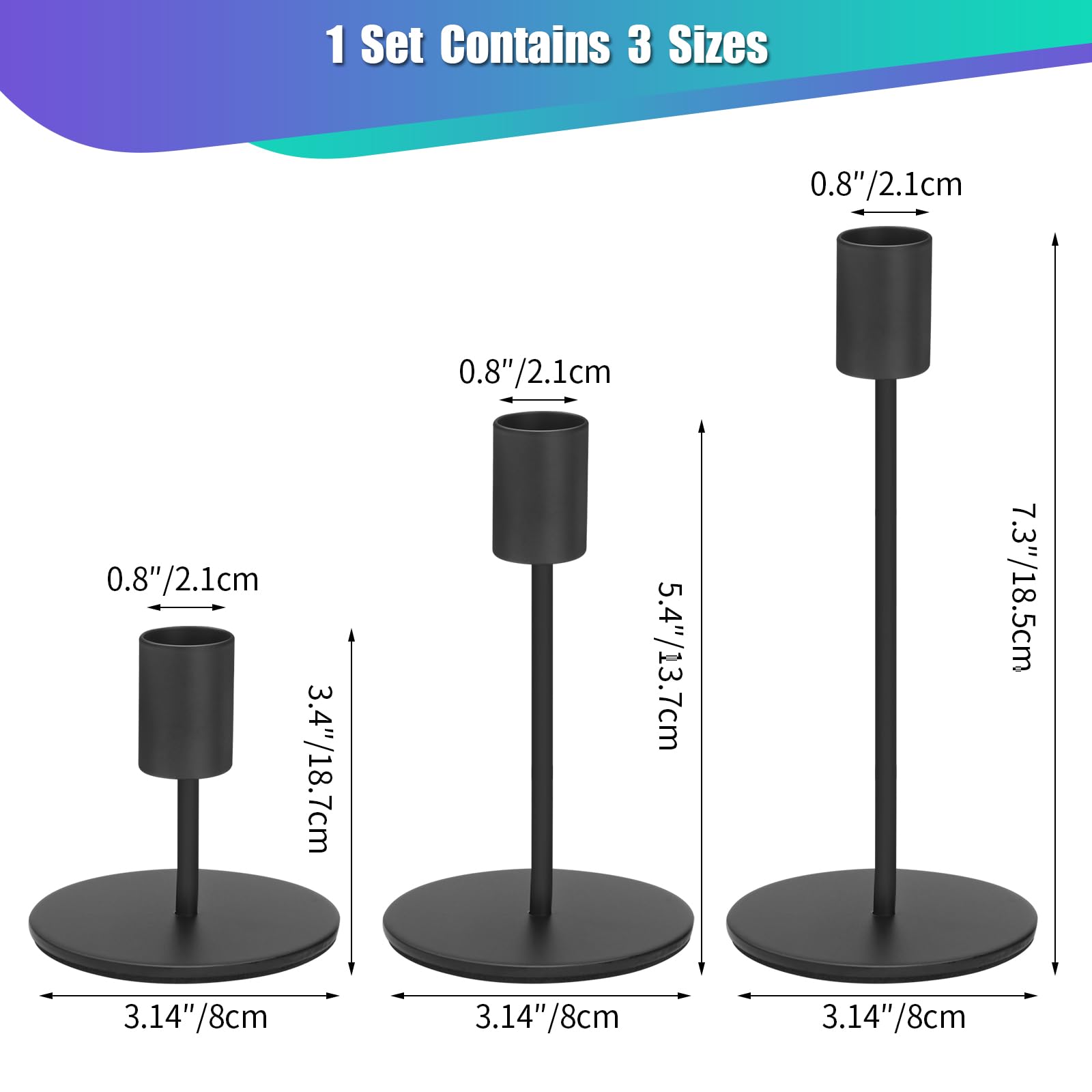 -Package included: 6PCS Black Candlestick Holders Black Candle Holder, Each size is 2 pcs.Size is 3.23''*3.15''(8.2cm*8cm), 5.2''*3.15''(13.2cm*8cm), 6.42''*3.15''(16.3cm*8cm), Candle holders only, Candles not included.