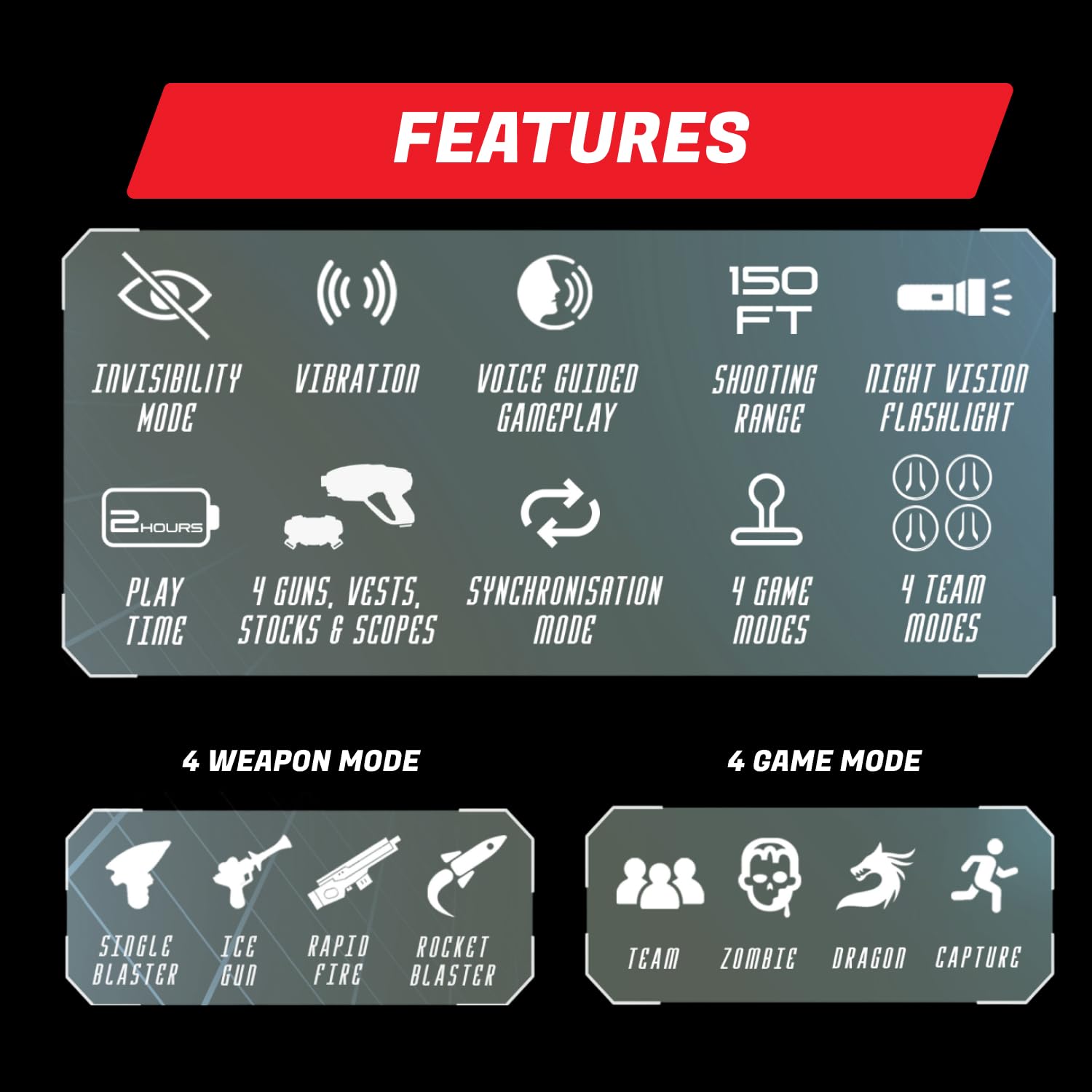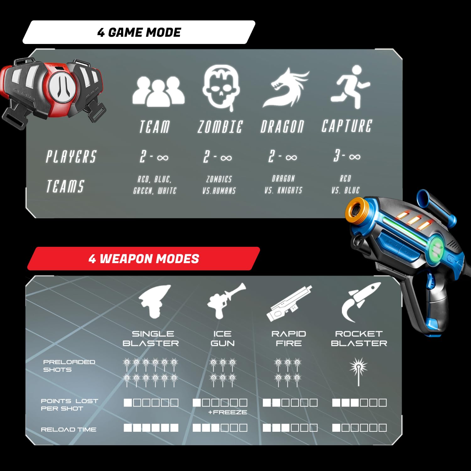 -EXCITING BATTLES: Experience heart-pounding laser tag battles with 4 modes - Team, Zombie, Dragon, and Capture. Each mode offers unique challenges for an adrenaline-fueled gaming.