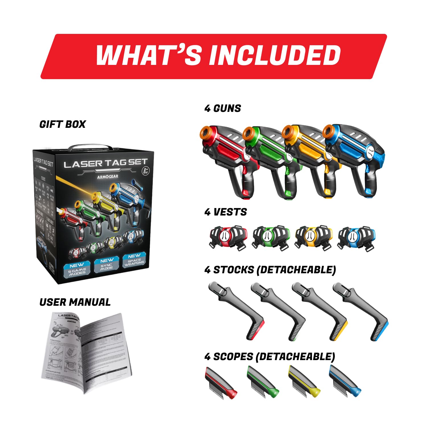 -COMPLETE SET: Includes 4 guns, 4 vests, 4 scopes, and 4 stocks—everything needed for epic laser tag battles. Batteries are not included for safety. Each blaster and vest operates on 3 AAA batteries.