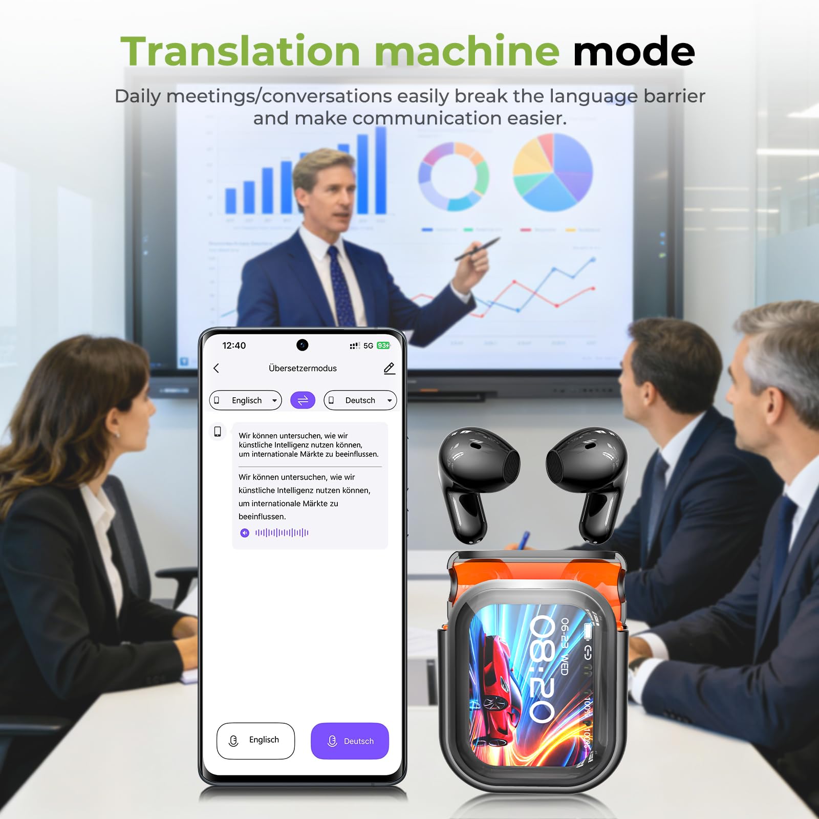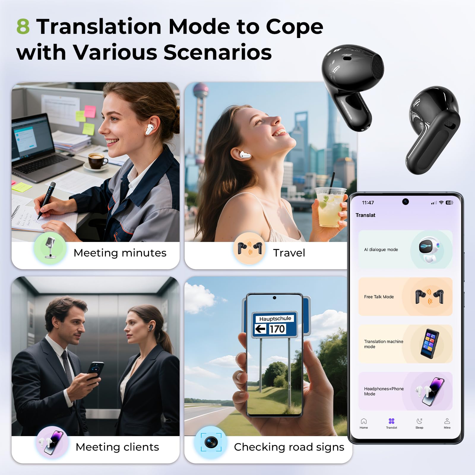 -✔ Multi-Scenario Translation Modes: An all-rounder for travel, business, and everyday life. Translation modes for every situation: a. Hands-free mode (real-time communication) b. Dual-ear control (click operation) c. Live photo translation (text recognition via camera) d. AI conversation mode (fluent dialogue) e. Conference mode (multilingual meetings) f. Dual mode (music & translation in parallel) g. Voice memos (automatic transcription)
