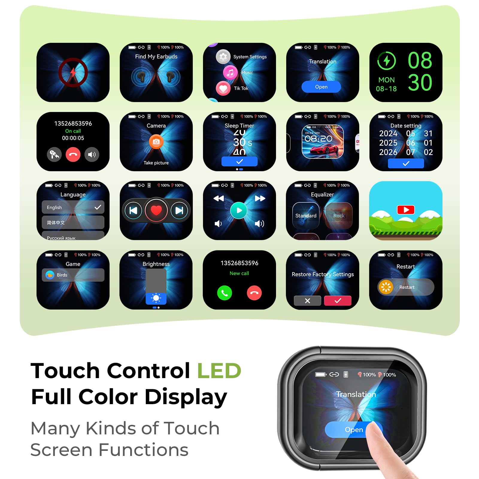 -✔ LCD Color Display with Touch Control: The high-definition touchscreen provides direct access to 15+ functions, including music playback control, an equalizer, voice dialing, and practical tools like an alarm clock, stopwatch, and remote camera — all operable without a smartphone. Backed by a 60-hour battery life that charges in just 1.5 hours, it ensures uninterrupted daily use.