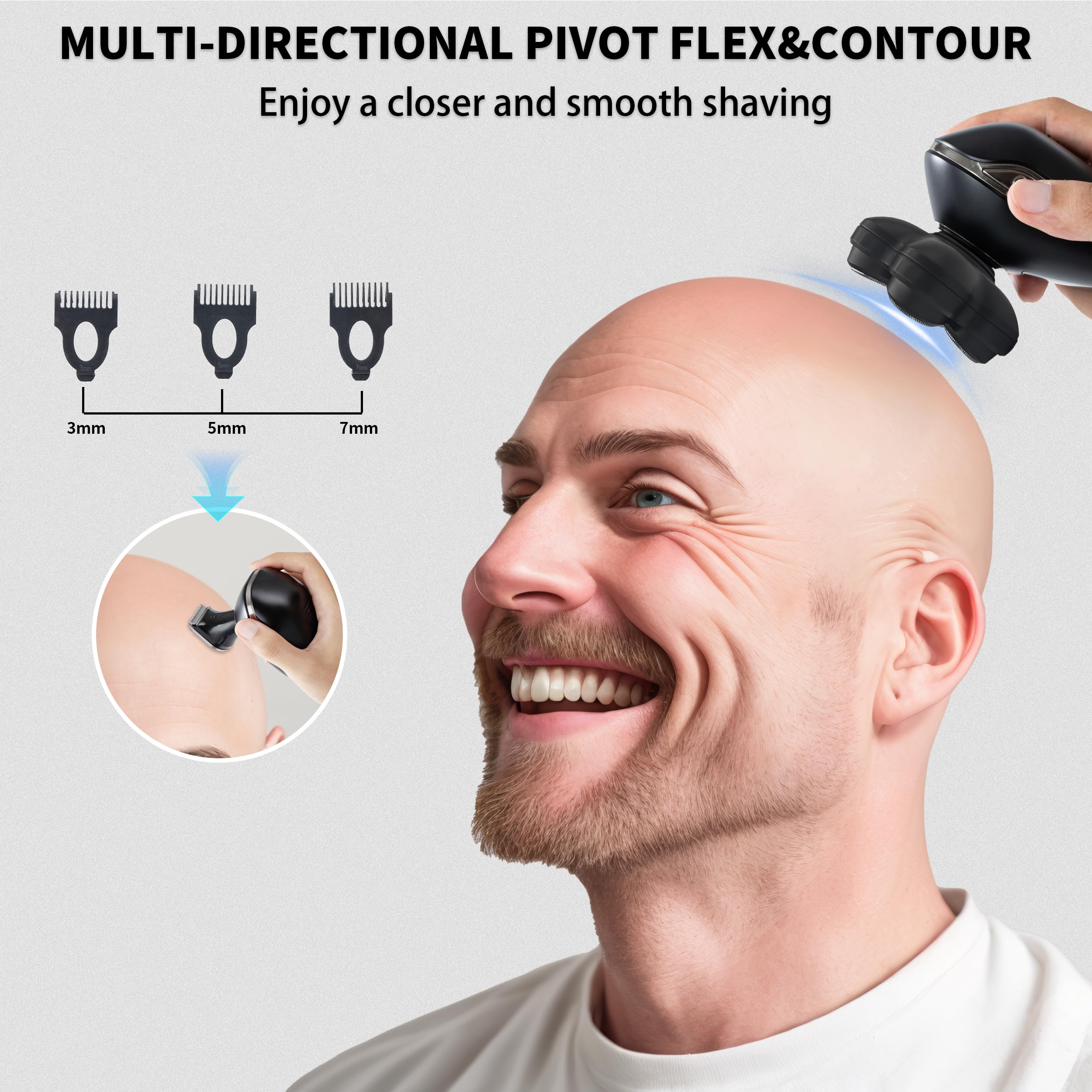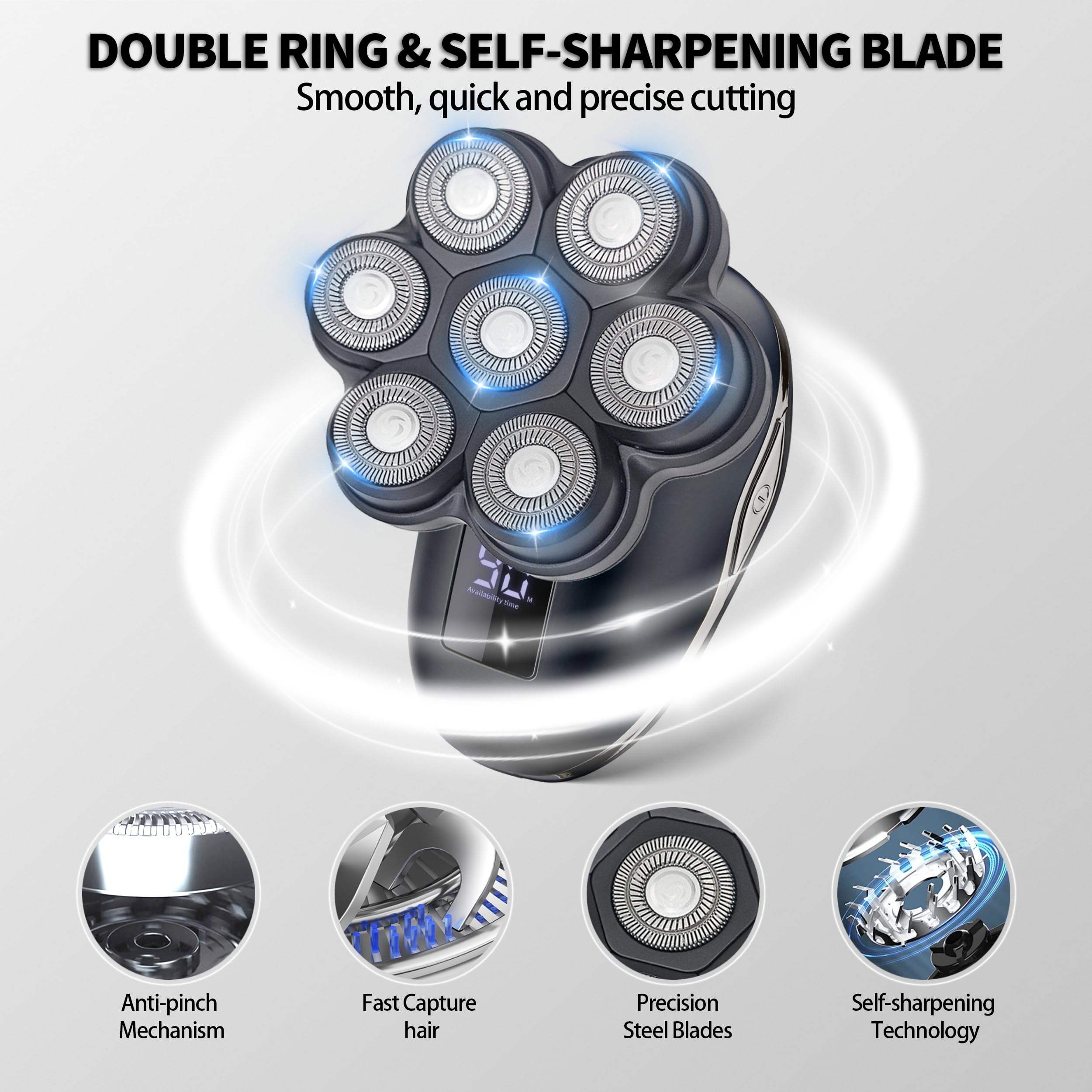 -[Ergnomic design & Smooth Shave]: The innovative ergnomic design of head shavers for bald men is more flexible and better to fit the contours of the face and head.High-quality floating double-ring steel blades with self-sharpening technology, are designed to capture the hair and cut hair close. All you need is to keep your head clean and smooth shave while remaining bump and irritation-free!