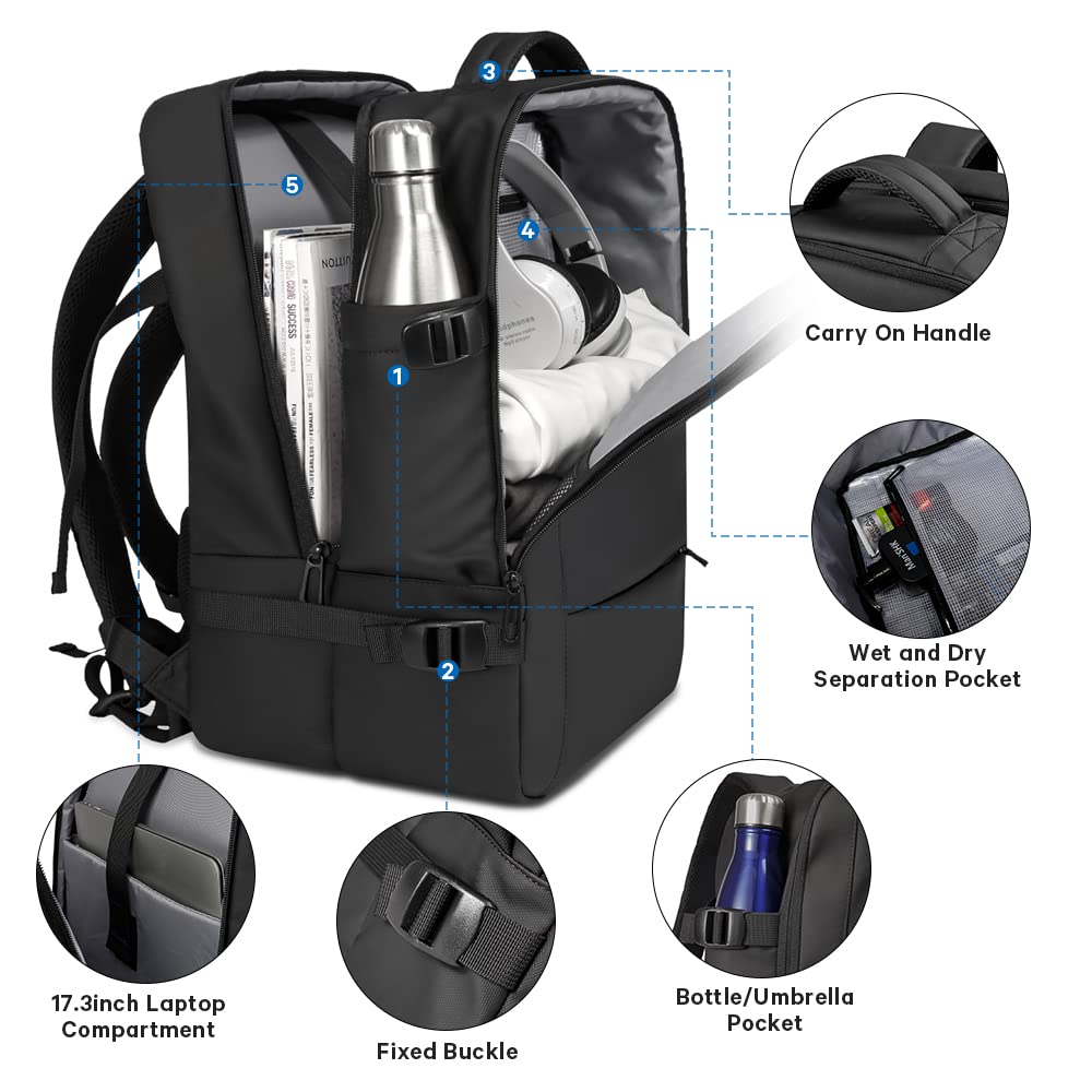 -【LARGE CAPACITY EASY TO CARRY-ON】:The backpack with many compartments, organization and expansion.The main pocket can hold your travel goods,fit 5-8pcs clothes. It is cool that there is a wet pouch to liquids.Front compartment can also hold magazines,Ipad and power bank which can charge your phone. 17inch laptop compartment size: 15.3" x 11.4" (please cheak your laptop size),Backpack Back with padded batter can protect your laptop.