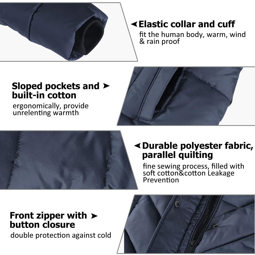 -Pockets & Cuffs: Features 3 pockets: two deep outer side pockets lined with a warm material to keep your hands cozy and one interior security pocket perfect for storing keys, phones, and other valuables. Elastic knit cuffs effectively block wind from entering the coat. The jacket is crafted with a new high-quality outer fabric that is windproof and water-repellent, providing insulation even when wet.