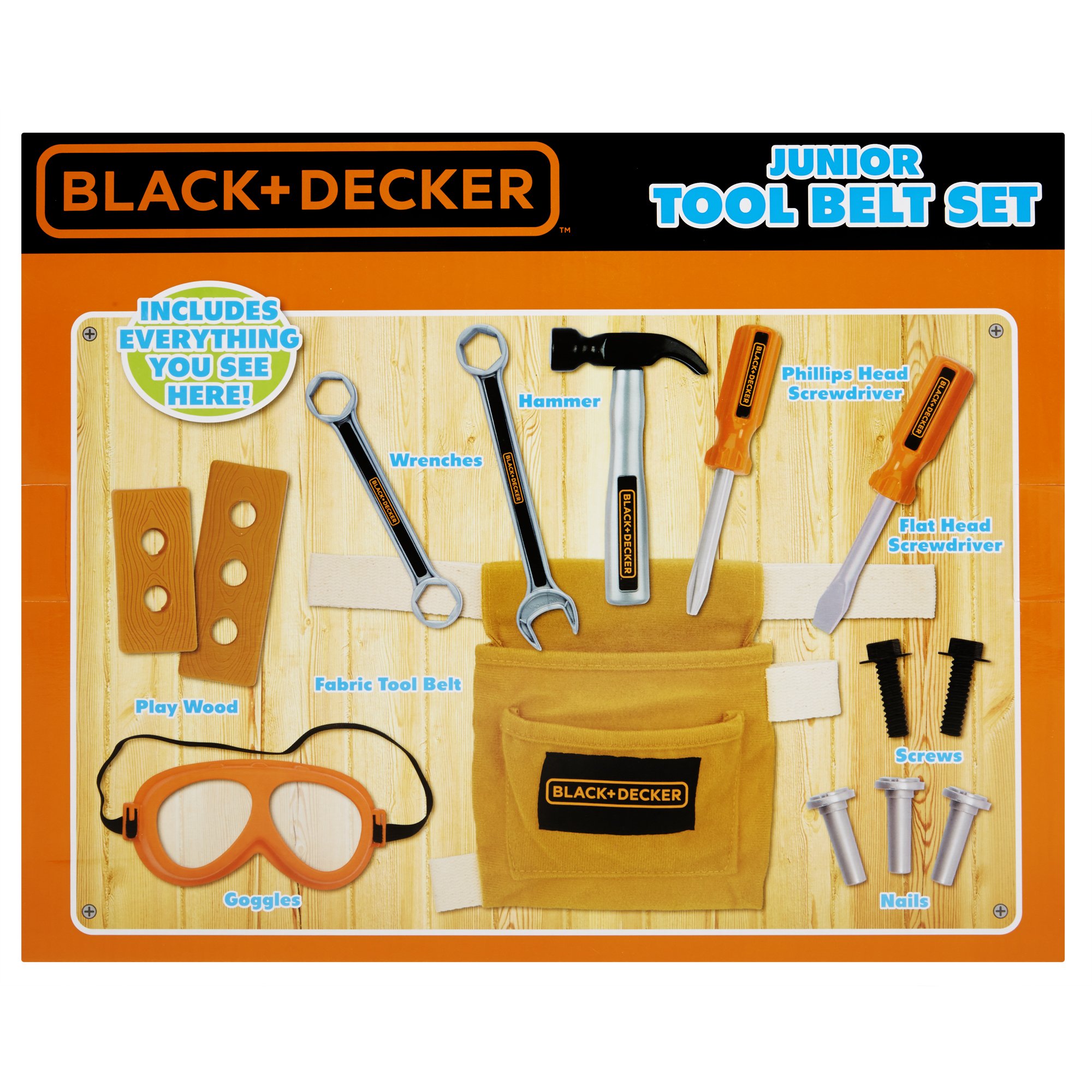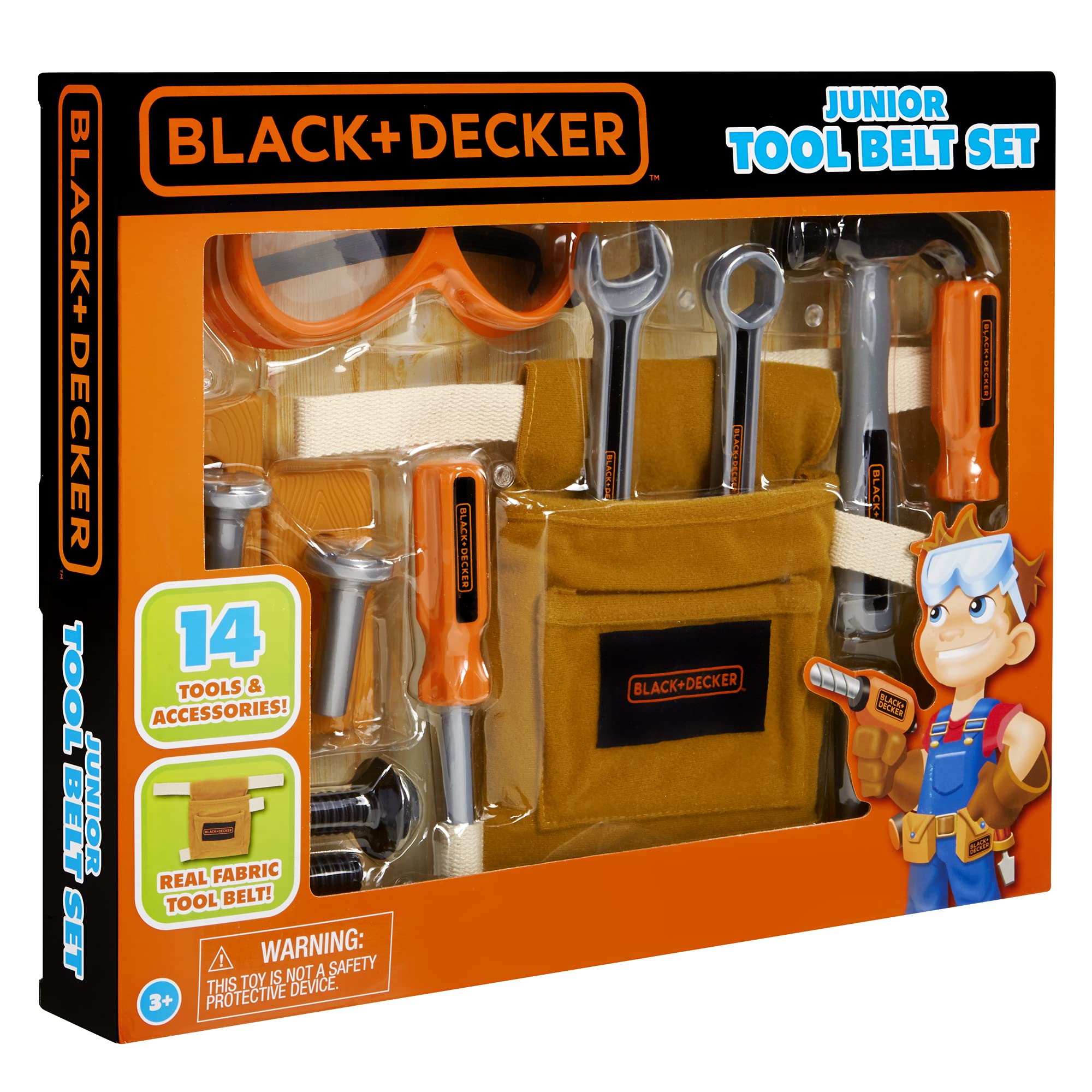 Product Description Make sure your little helper is ready for any job with the Black and Decker Junior Tool Belt Set. This 14-piece set comes with realistic-looking kids' tools, including a hammer, screwdriver, wrench, nails and other accessories round out the set. Tuck it all away in the included kids' tool belt, complete with the Black and Decker logo. For ages 3 and up. Brand Story By Black & Decker Junior