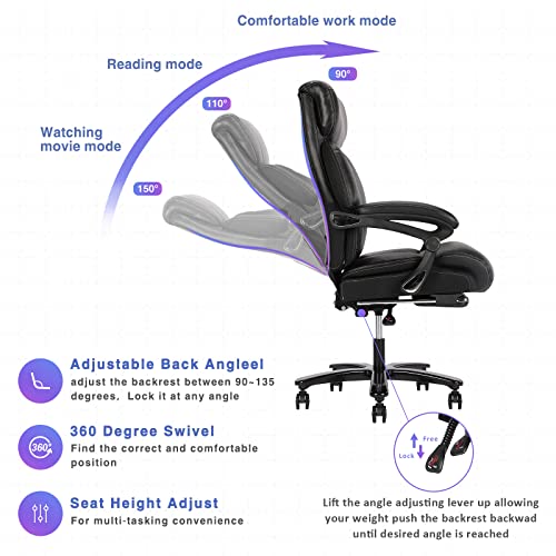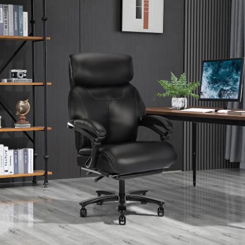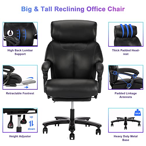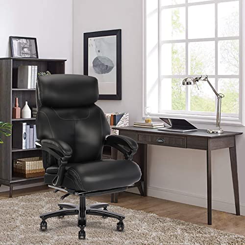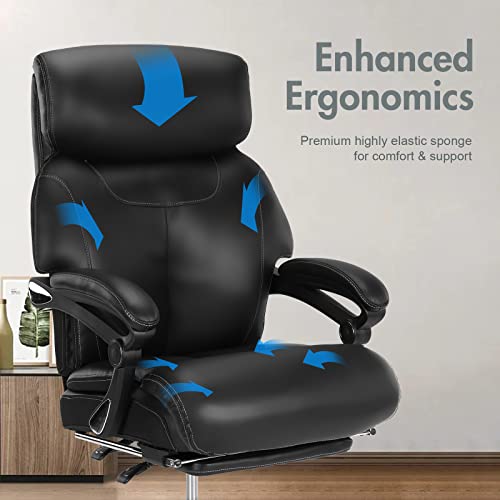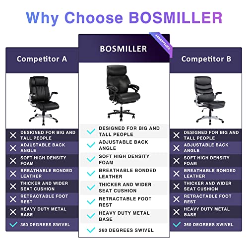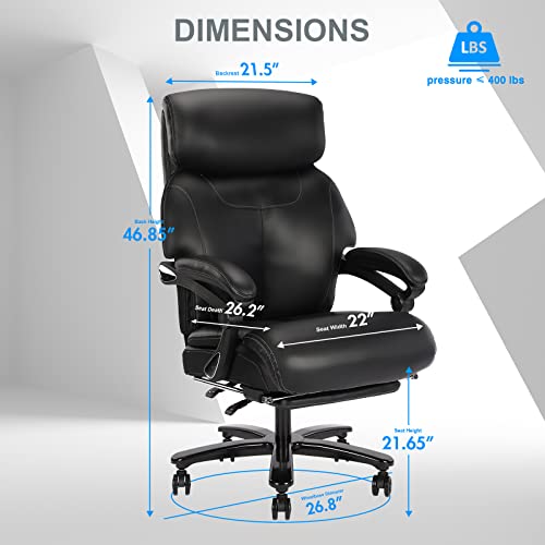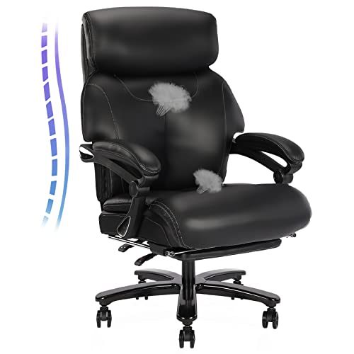 BOSMILLER Silla de oficina grande y alta de 400 lb para personas pesadas con cojín de asiento de espuma viscoelástica doble acolchado Silla de oficina ejecutiva de cuero con soporte lumbar y reposapiés ajustable para el trabajo en el hogar