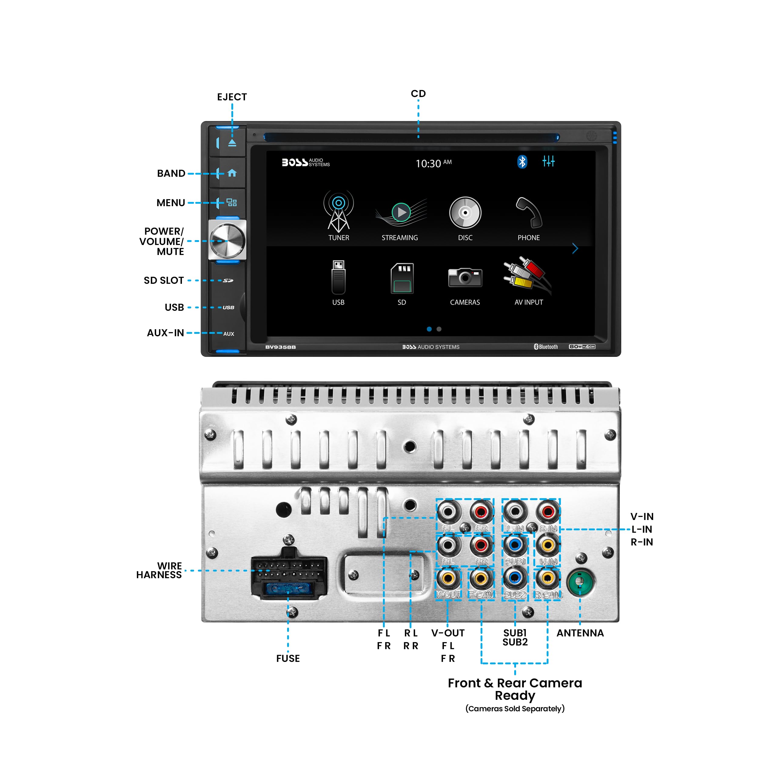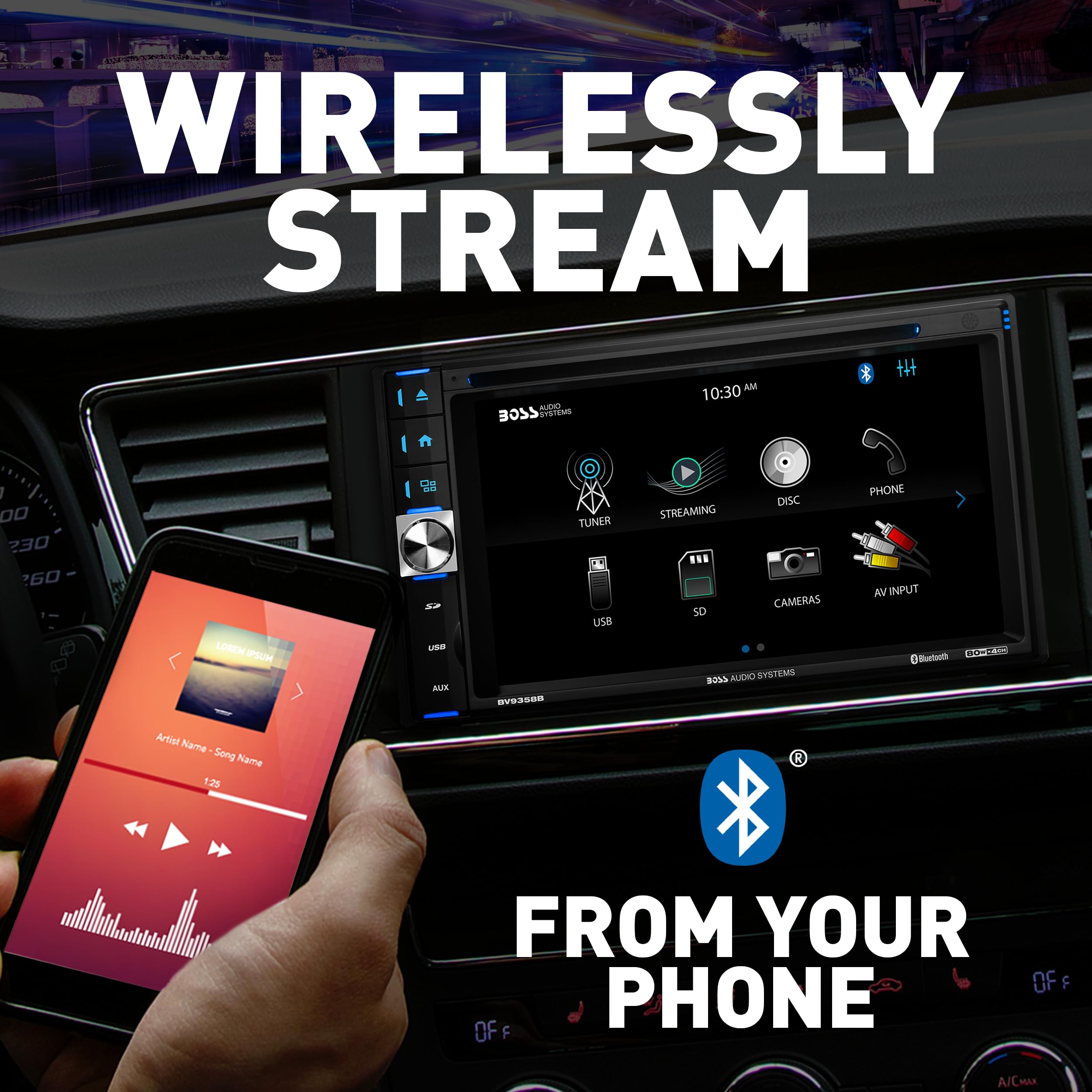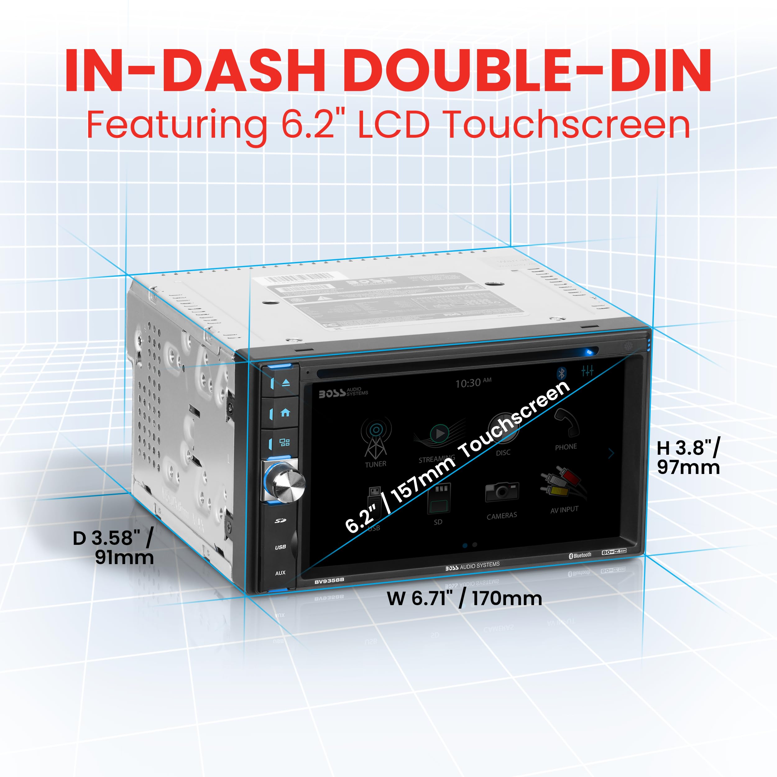 Enjoy movies, music or talk radio when you hit the road with the BOSS AUDIO SYSTEMS BV9358B Double-DIN DVD Player with a 6.2-inch Touchscreen Monitor. Pop in a DVD/CD, connect your Smartphone or MP3 Player to the Auxiliary Input, turn on the AM/FM radio or plug into the USB and SD ports for more music options. You can also charge USB devices with the USB port. Bluetooth technology lets you play and control music apps like Pandora and Spotify and make calls hands-free. Choose your sound style with the built-in Preset EQ. Control it all with the Wireless Remote, your existing Steering Wheel Controls (interface sold separately) or the Touchscreen. Enjoy more entertainment choices with the BOSS AUDIO SYSTEMS BV9358B. For further product details, please scroll down.