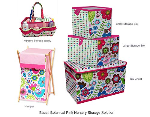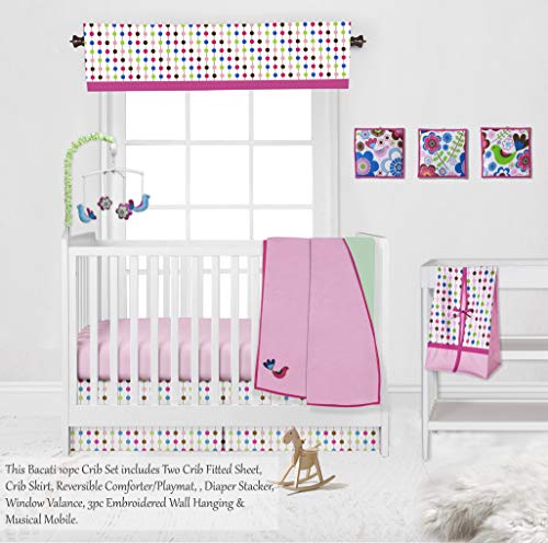 Bacati Botanical Sanctuary with birds multicolor 10-piece Crib Set Includes Comforter, 2 Crib fitted sheet, Dust ruffle, Diaper Stacker, Valance, Mobile, and 3 piece Wall Hanging Set. The comforter is reversible, one side with pink fabric with embroidered bird and other side has solid green. Bright Pink chording with rounded corners. Soft 100% cotton percale fabric with lofty polyester fill and machine washable. Cotton is a green fabric as it is renewable resource & biodegradable. Cotton is breathable making it more comfortable in extreme climates. Cotton is inherently soft delicate on skin of babies, durable & user friendly. Cottons gentle quality makes it appropriate for Babies with very sensitive skin or skin allergies.