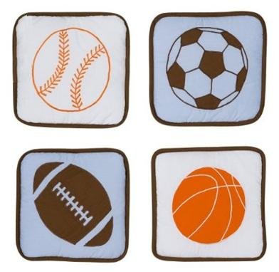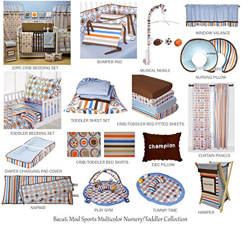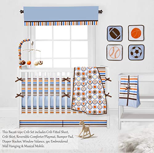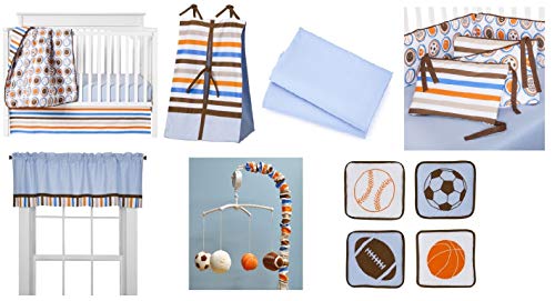 - Modern Sports Theme - Blues, Brown with Orange Accent - Includes Bumper Pad, Crib Skirt, Crib Fitted Sheet, Crib Comforter, 4 pc Wall Hanging Set, Window Valance, Diaper Stacker - FREE MUSICAL MOBILE INCLUDED IN THIS SET