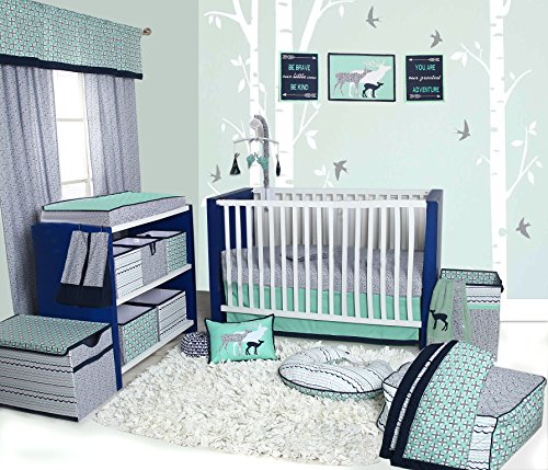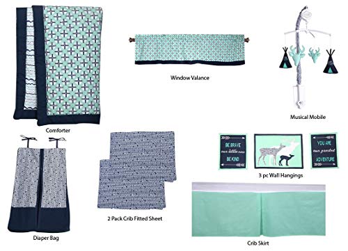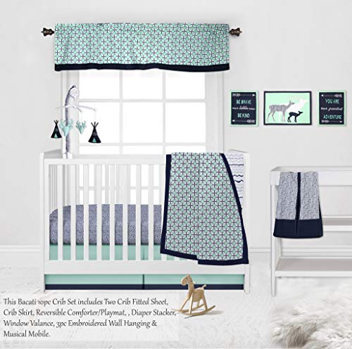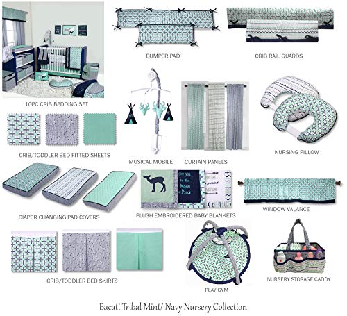 Bacati - Juego de cama de cuna unisex de percal de algodón 100% percal de 10 piezas de Noah Tribal con 2 sábanas ajustables para cuna (almohadilla de parachoques no incluida) para cunas estándar de EE. UU. (Mint / Navy)