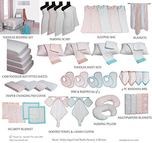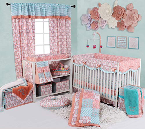 - FUN, COLORFUL & SIGNATURE PRINTS : Bacati Paisley Coral/Aqua Baby Girl Crib Bedding collection provides everything you need to create a unique nursery for your angel; 10 piece crib set with long side crib rail guard includes reversible patchwork coverlet/comforter, One Reversible Long Side Crib Rail Guard, 3 layer ruffled crib skirt/dust ruffle, one crib fitted sheet, diaper stacker, one window valance, Musical Mobile and three wall hangings.
