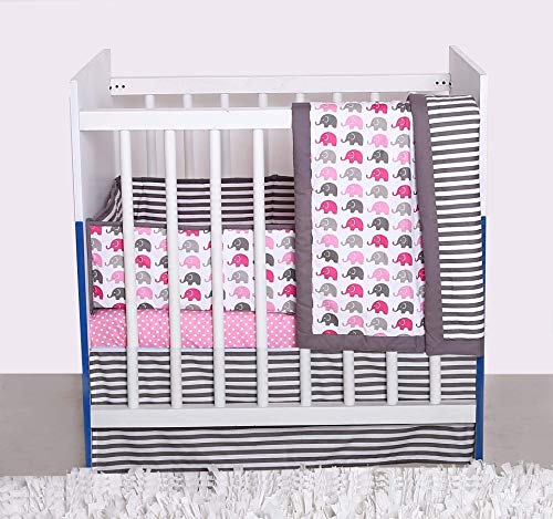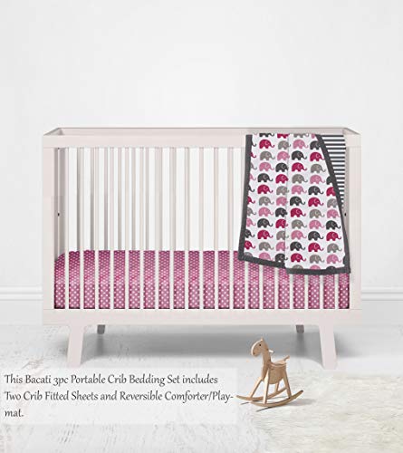 Bacati - Elefante, rosa / fucsia / gris, juego de cama para cuna portátil o pequeño para guardería de 3 piezas con edredón, 2 sábanas ajustadas para cuna, rosa, fucsia, gris, blanco, carbón