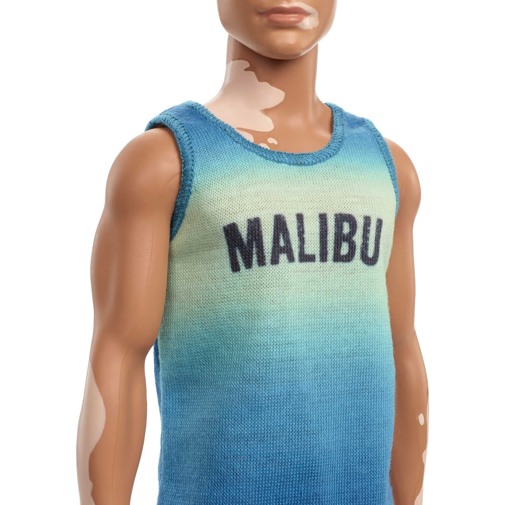 -Ken doll has an original body shape with vitiligo and sports a blue ombre Malibu tank paired with red shorts for a beachy vibe.