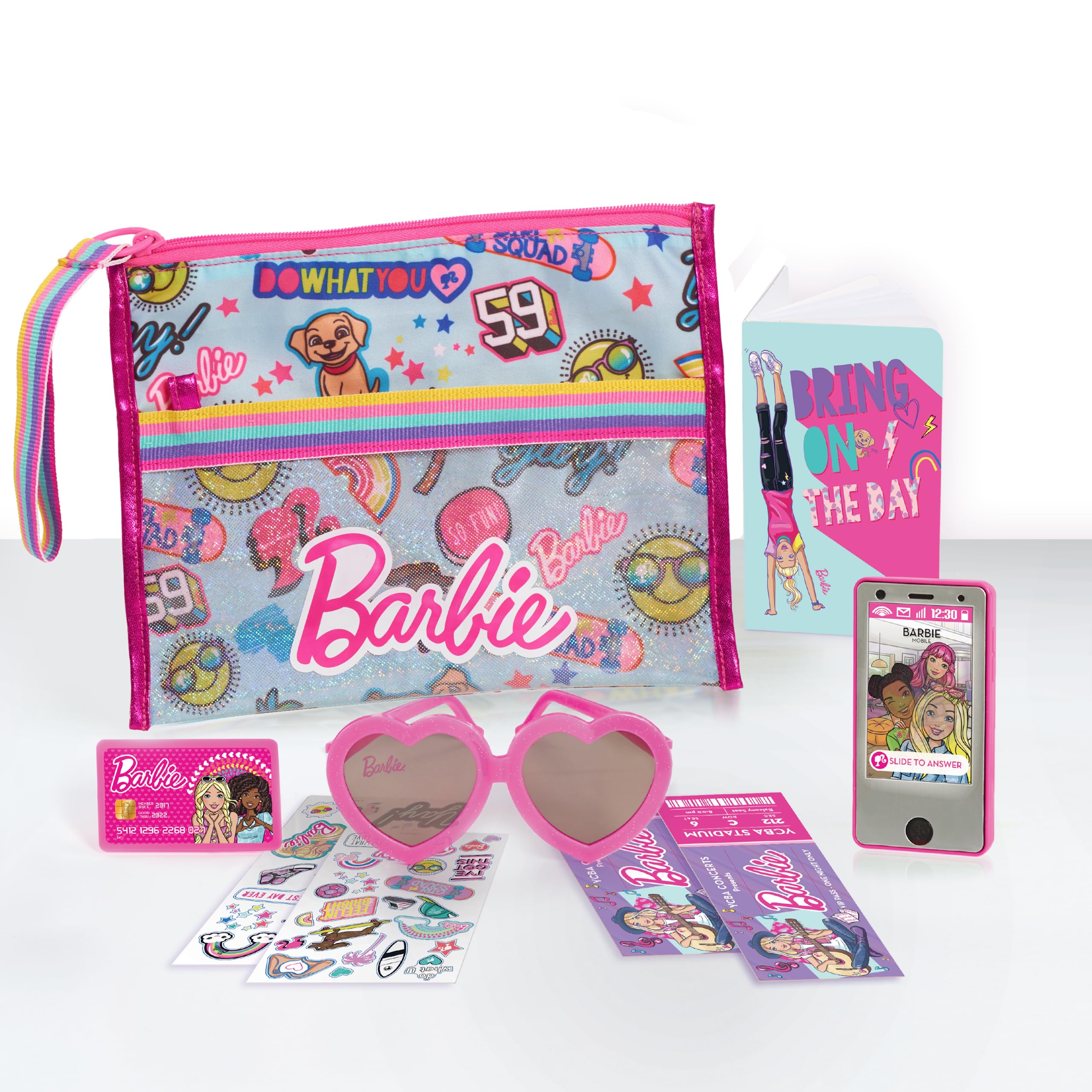 Be a Barbie fashionista with the Barbie Electronic 10-Piece Purse Set! This trendy purse set features floating glitter and holographic vinyl. The fashionable accessories are perfect for pretend play! Kids can call their friend Barbie on the cellphone that rings and lights up. As they plan their next shopping trip, they can get ready in style with the mirror and heart shaped sunglasses. This fab set also includes a notebook and stickers empowering kids to bring on the day. Set includes a purse, cellphone, credit card, sunglasses, notebook and stickers, and a trapped glitter keychain charm. Ages 3+