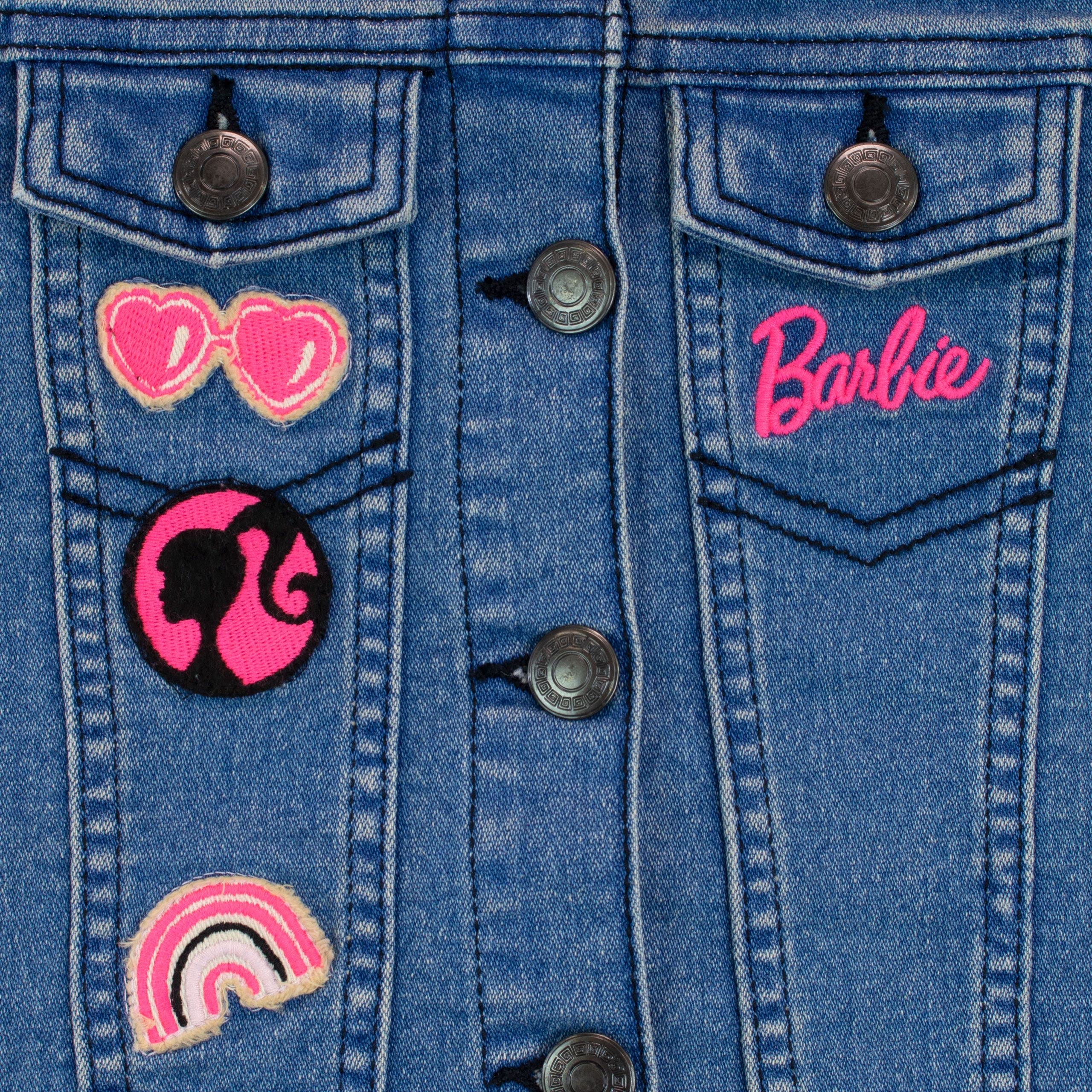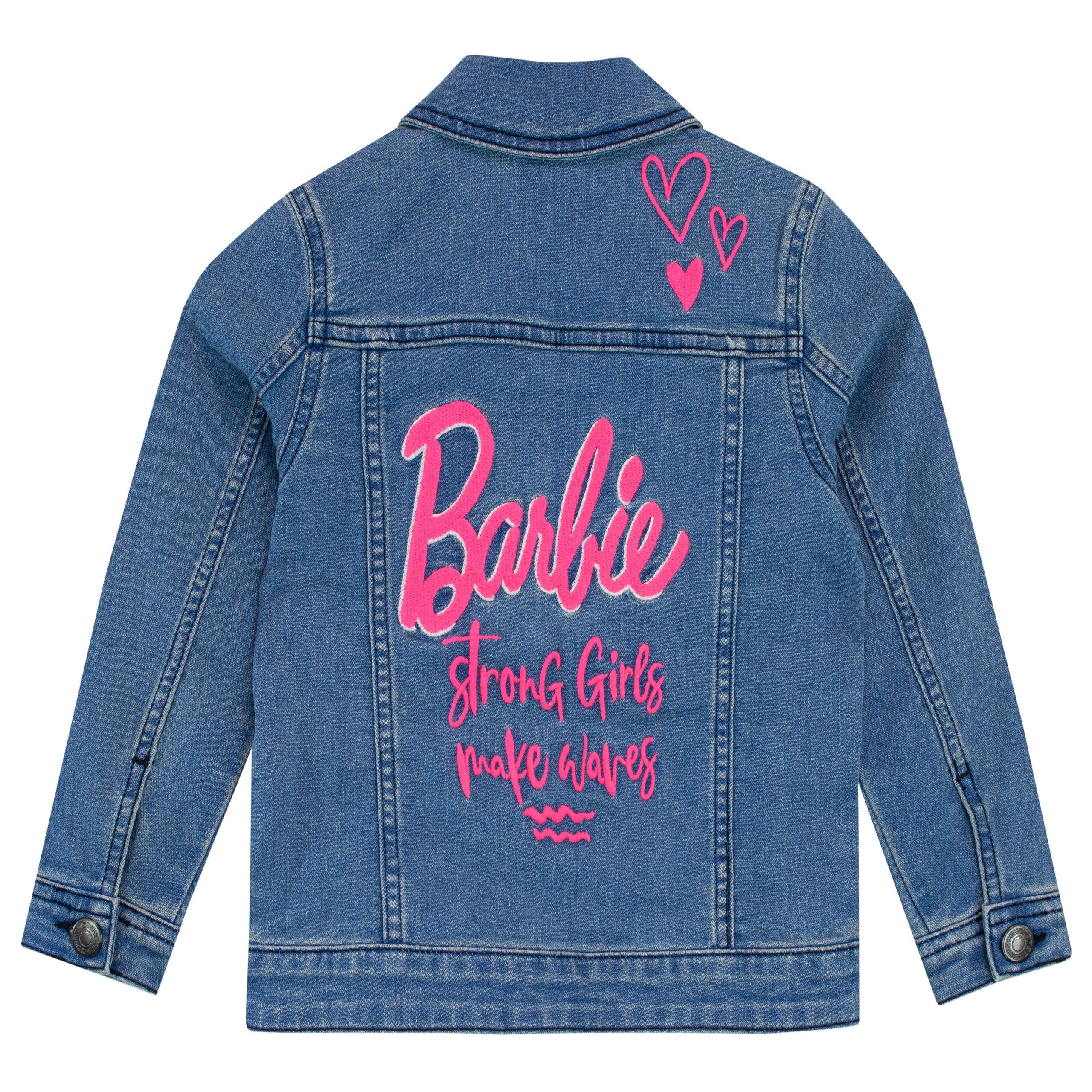 Description Girls Barbie Jean Jacket. Empower your Barbie fan with this stylish denim jacket! Fastened with buttons, this jacket features pink embroidery of the Barbie logo and symbol, sunglasses and a rainbow on the front, along with a silver glitter patch on the hem that reads 'Do Your Thing'. On the back is the wording 'Barbie' and 'Strong Girls Make Waves' with hearts, all embroidered in pink. They'll love to make waves with this amazing Barbie denim coat!