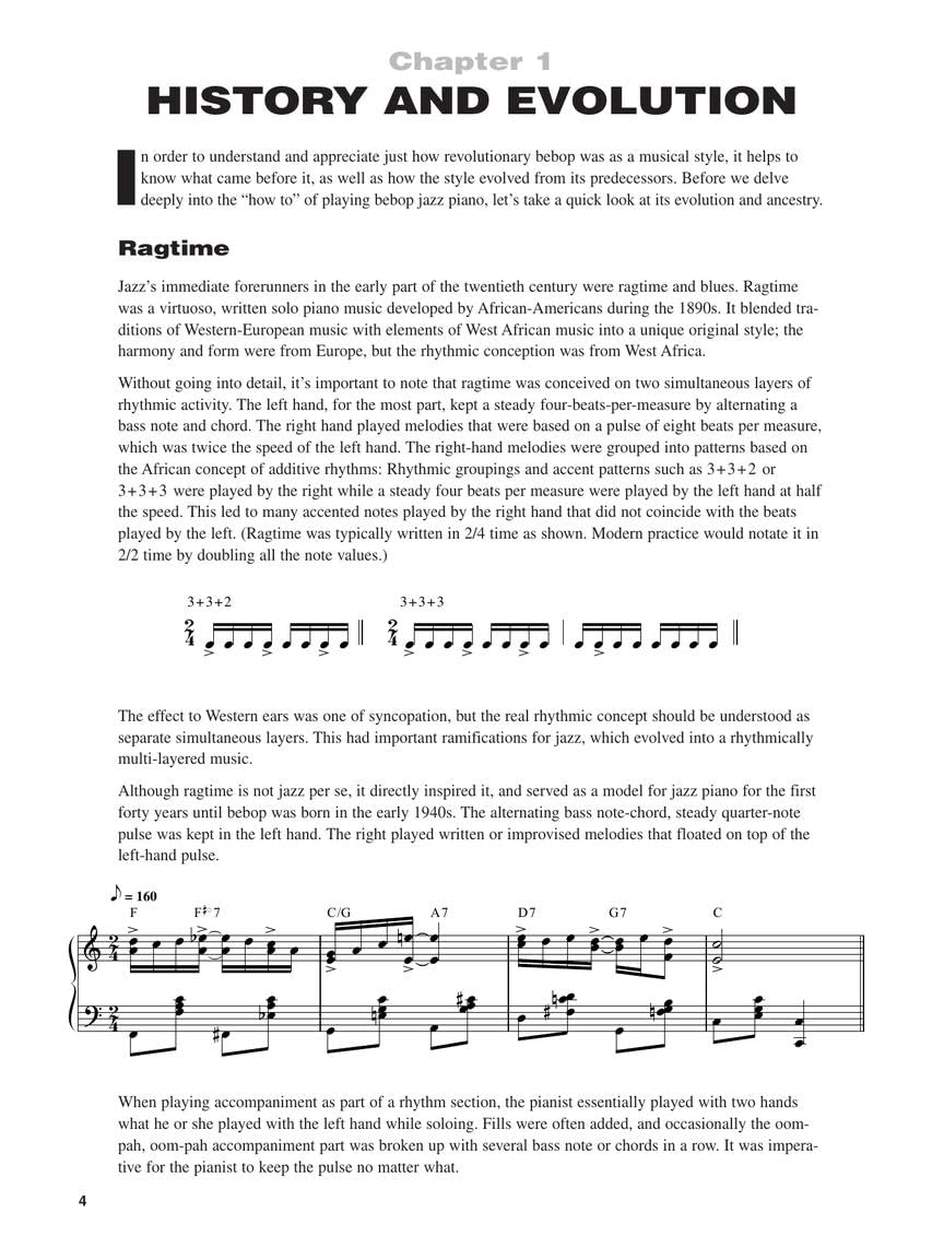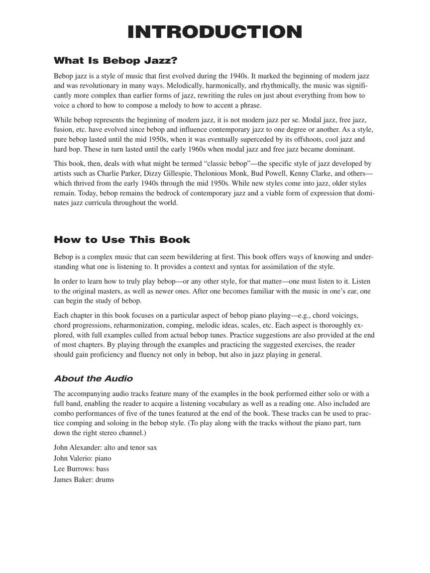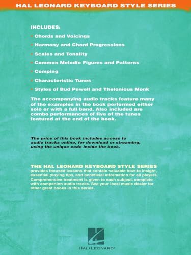 (Keyboard Instruction). In this book in the Hal Leonard Keyboard Style Series, author John Valerio provides essential, detailed information for bebop and jazz pianists on the following topics: chords and voicings, harmony and chord progressions, scales and tonality, common melodic figures and patterns, comping, characteristic tunes, the styles of Bud Powell and Thelonious Monk, and much more. The accompanying online audio features many of the examples in the book performed either solo or with a full band. Also included are combo performances of five of the tunes featured at the end of the book. Audio is accessed online using the unique code inside the book and can be streamed or downloaded. The audio files include PLAYBACK+. a multi-functional audio player that allows you to slow down audio without changing pitch, set loop points, change keys, and pan left or right.