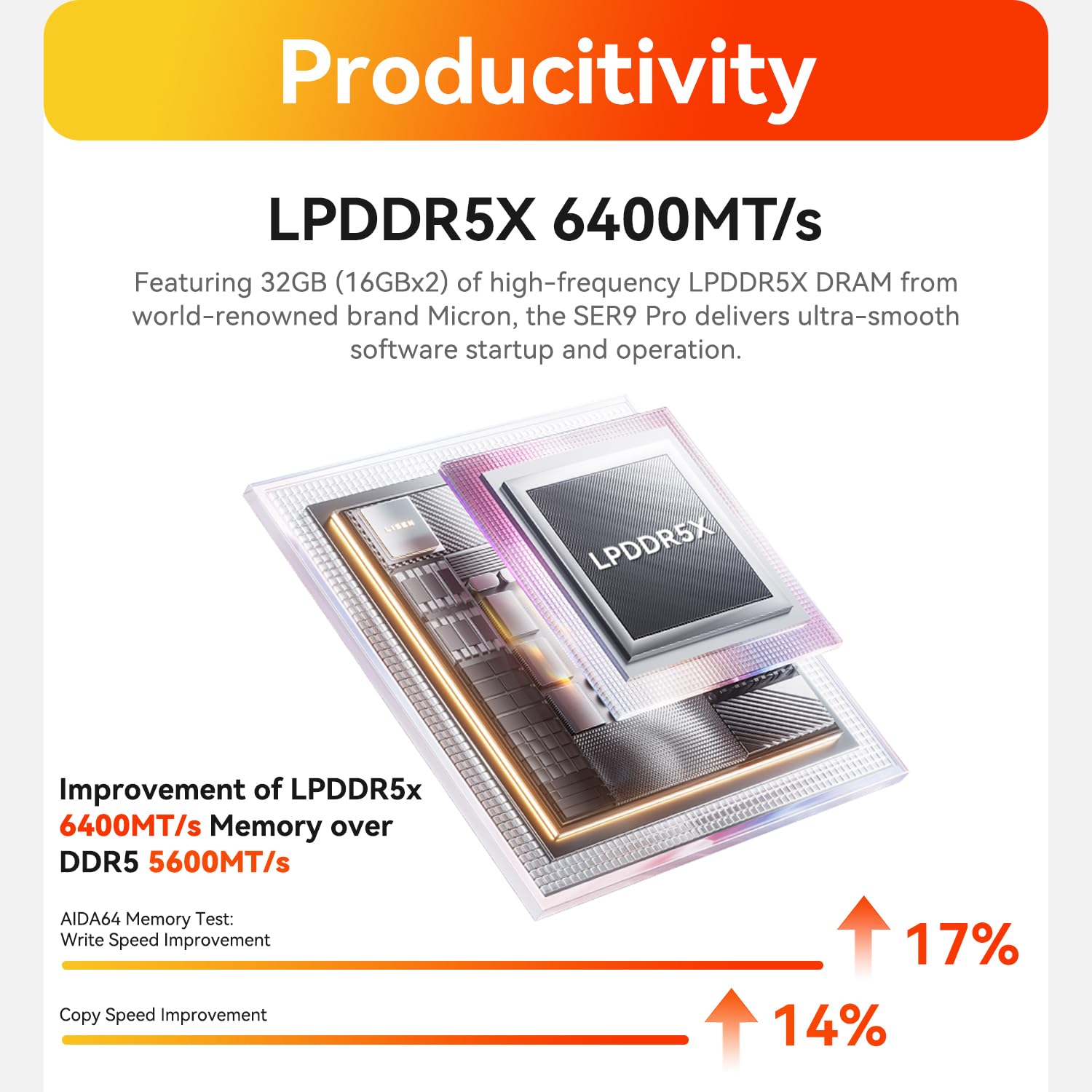 -✅ 32GB LPDDR5 and 1TB SSD - SER9 Pro H 255 mini PC is equipped with 32GB (2*16GB) LPDDR5 RAM. LPDDR5 memory runs at 6400MT/s, which is 18% faster than DDR5 at 5400MHz. The speed of PCle Gen 4.0 hard drive is 4500MB/s. Standard M.2 2280 NVMe PCIE4.0 1TB SSD, dual channel expandable to 8TB (2 * 4TB). The Beelink SER9 small PC has ample storage space and fast response time, so you can easily meet your work needs.