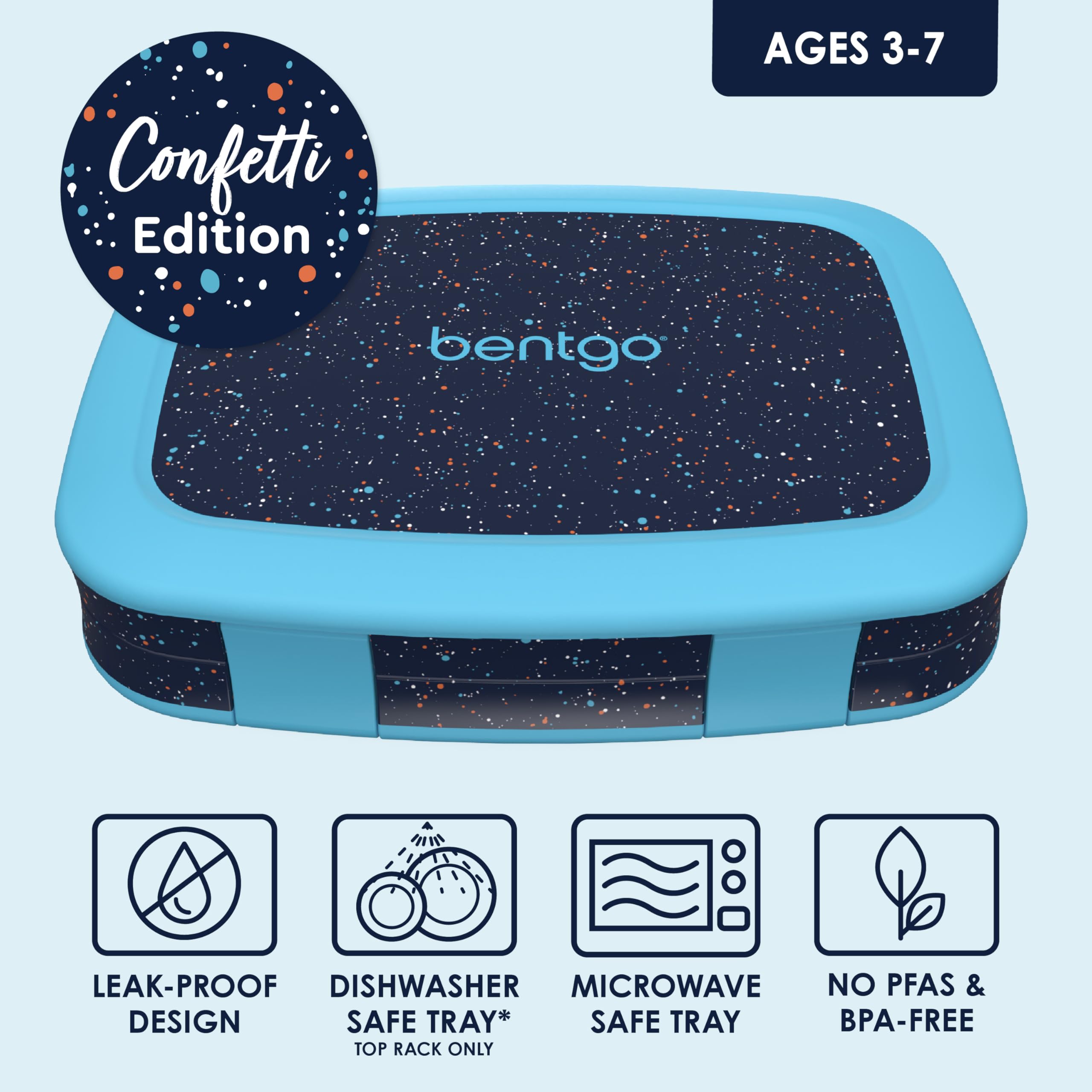 Bentgo Kids Fiambrera de 5 compartimentos - Diseño de confeti para la escuela, ideal para edades de 3 a 7 años, a prueba de fugas, a prueba de caídas, apta para lavavajillas y fabricada con materiales libres de PFAS y BPA (Edición Confeti - Azul Abismo)