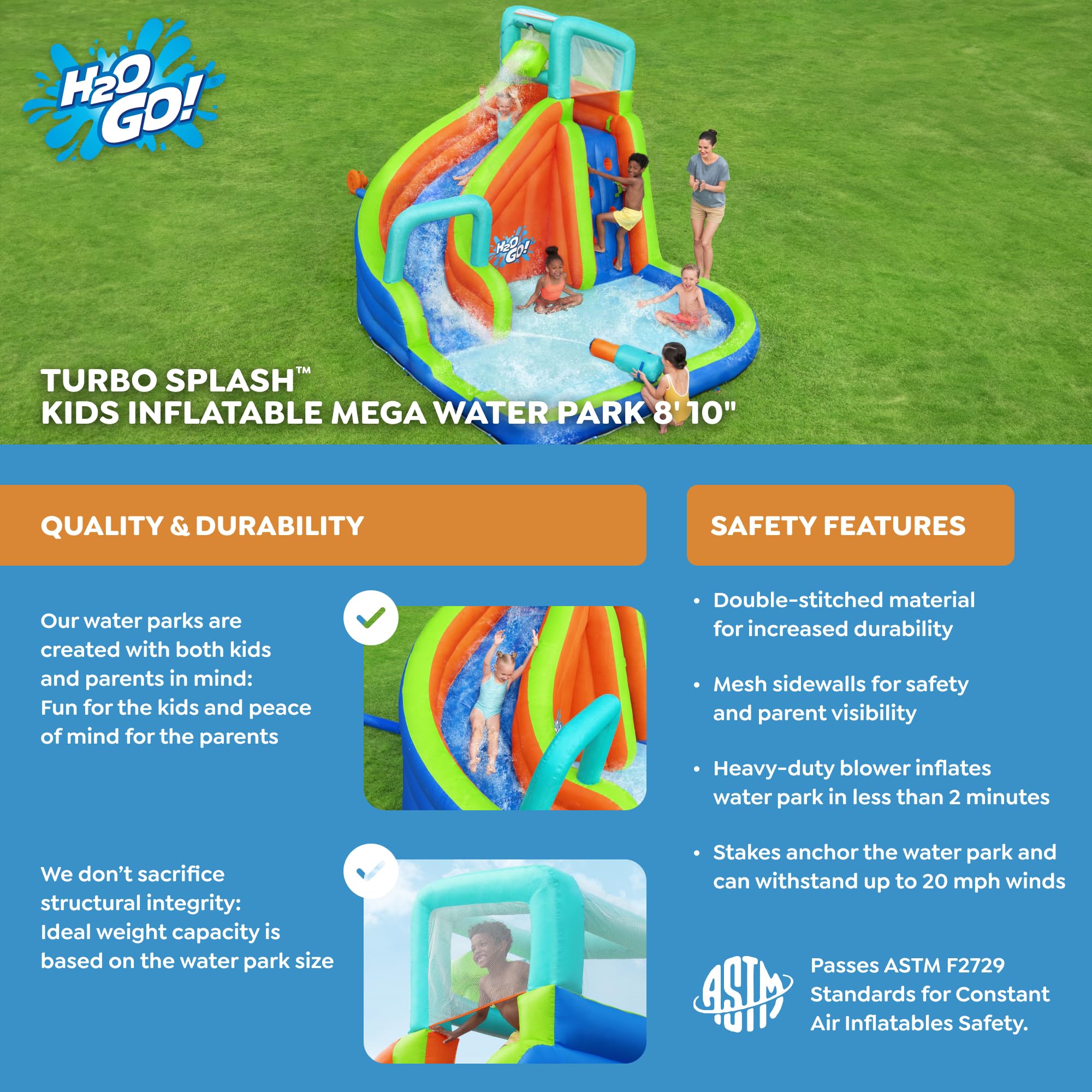 Start your engines and get ready to race through the H2OGO Turbo Splash Mega Water Park Start with the climbing wall, which has padded grab handles and footholds, all the way up to the top of the tower. There, you'll find mesh safety walls and a curved slide that will get you back down to the bottom in record time. This park also features a surprise soak bucket at the top of the tower that spontaneously dumps water to keep the slide slick and slippery. Along with a large splash pool for playing or lounging, there is a point 'n spray water blaster that shoots out a stream of water wherever it is directed. This park goes from box to backyard party in just 2 minutes by using the included air blower for inflation. Plus, with its double-stitched polyester fabric construction, this park is built to last. The H2OGO Turbo Splash Mega Water Park promises ultimate speed, ultimate fun and ultimate durability.