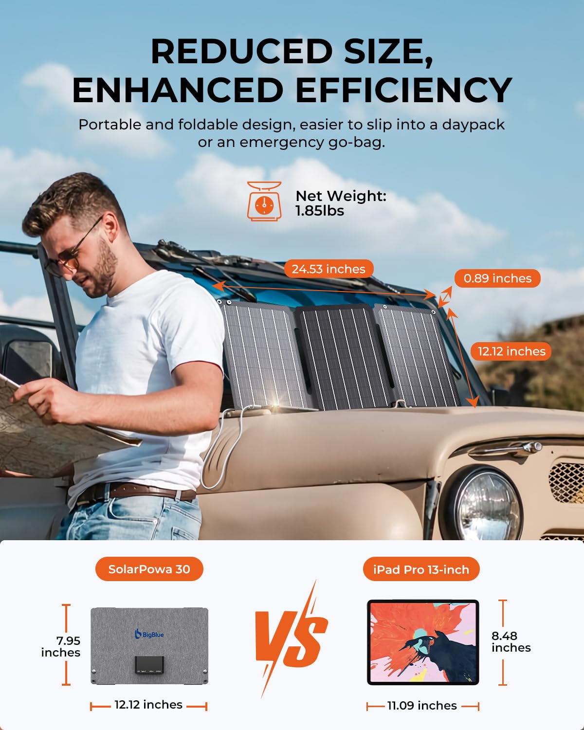 -ULTRA-PORTABLE AND PRACTICAL: BigBlue 30W solar panel is designed for ultimate portability, folding size measures just 7.95x12.12x1.46 in and weighs just 1.85lbs, making it easy to pack and carry wherever you go. Just unfold, angle toward the sun, and connect, it’s that simple to start powering your devices (Note: this folding solar panel can't store the electricity)