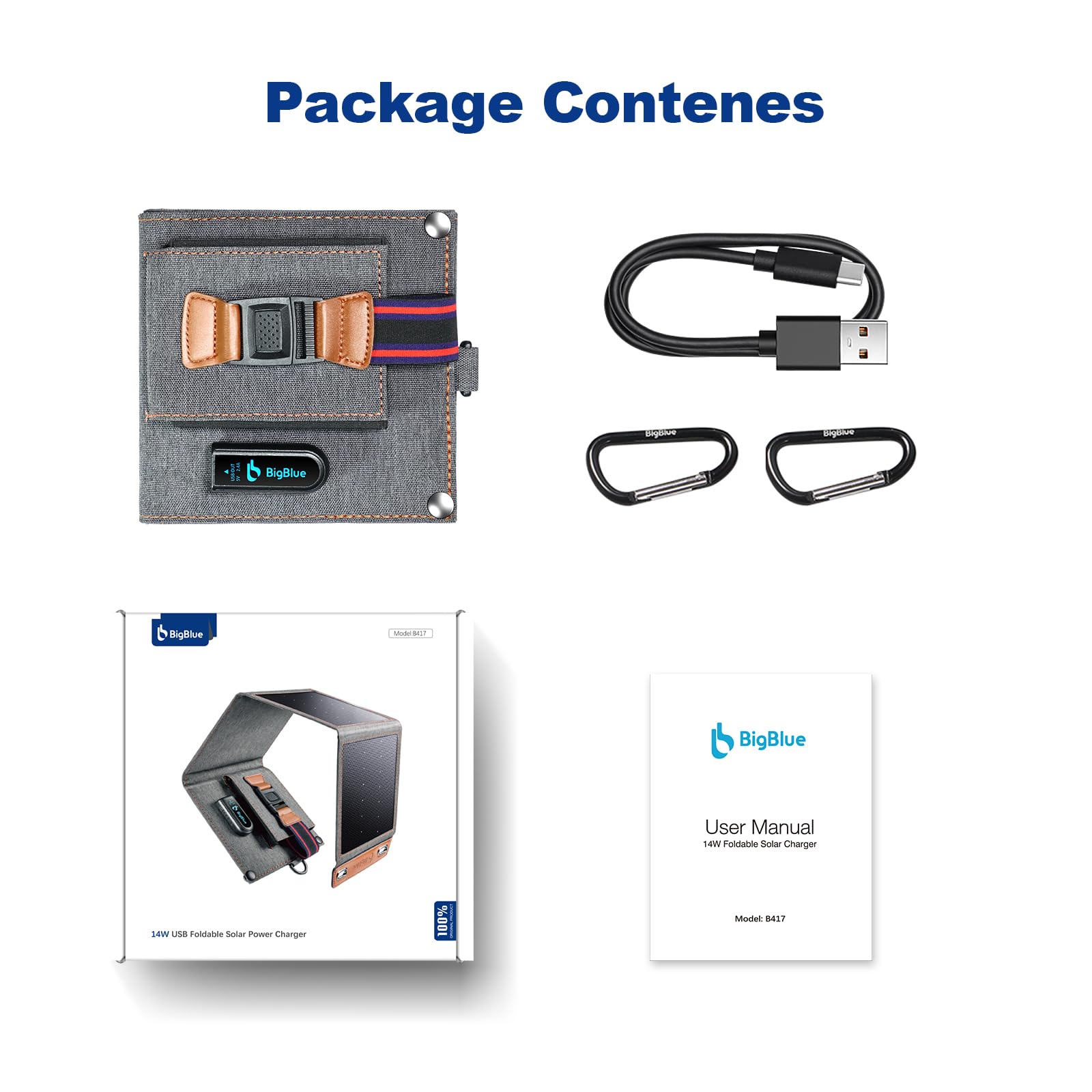 -Easy to Operate: Please unfold all solar panels in direct sunlight outdoors, and place them perpendicularly to the sun's rays to capture maximum sunlight; then connect your devices to the USB-A port with a certificated cable. What you'll get: 1x 14w solar USB charger, 1x USB-A to USB-C cable, 2x carabiners, 1x user manual and our friendly customer service