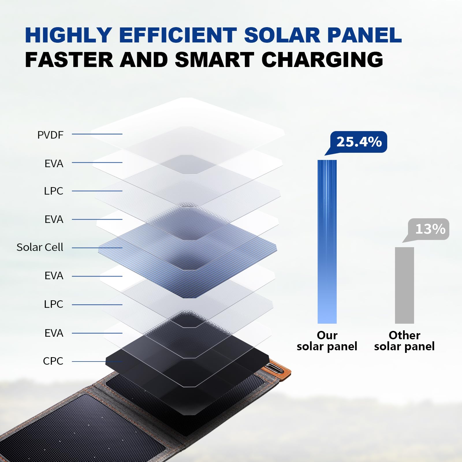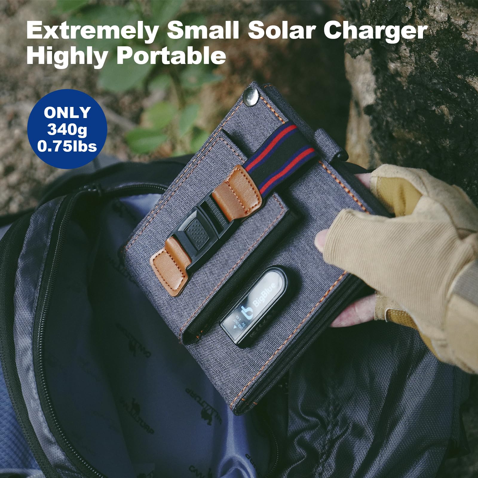 -Remarkable Solar Power Efficiency: Using BigBlue's upgraded lamination technology, the efficiency of converting solar energy into electricity is up to 25.4%. Note: this portable solar charger can't store electricity, the angle toward sunlight, operating temperature, and sunlight intensity will affect the real output